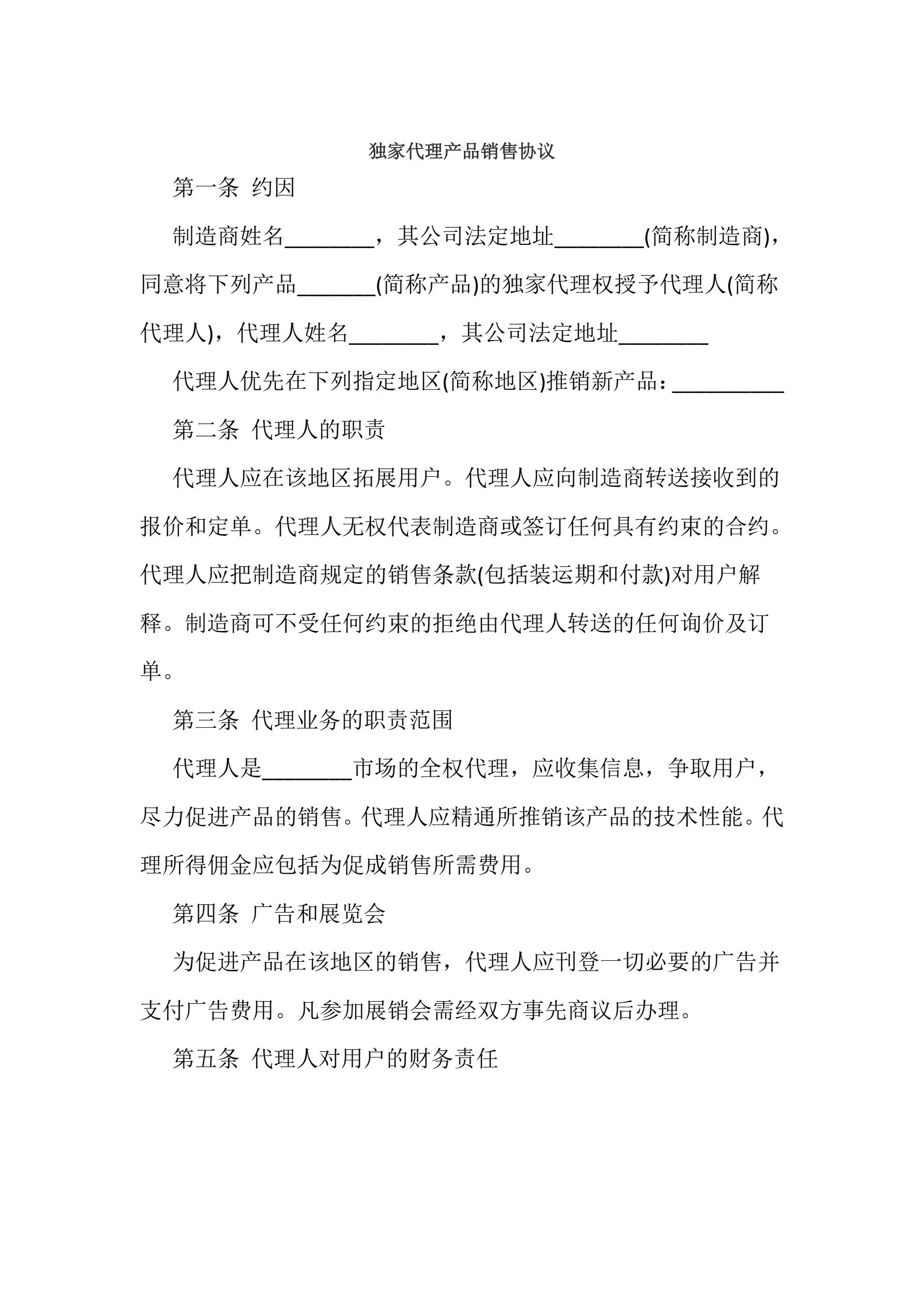 >独家代理产品销售协议