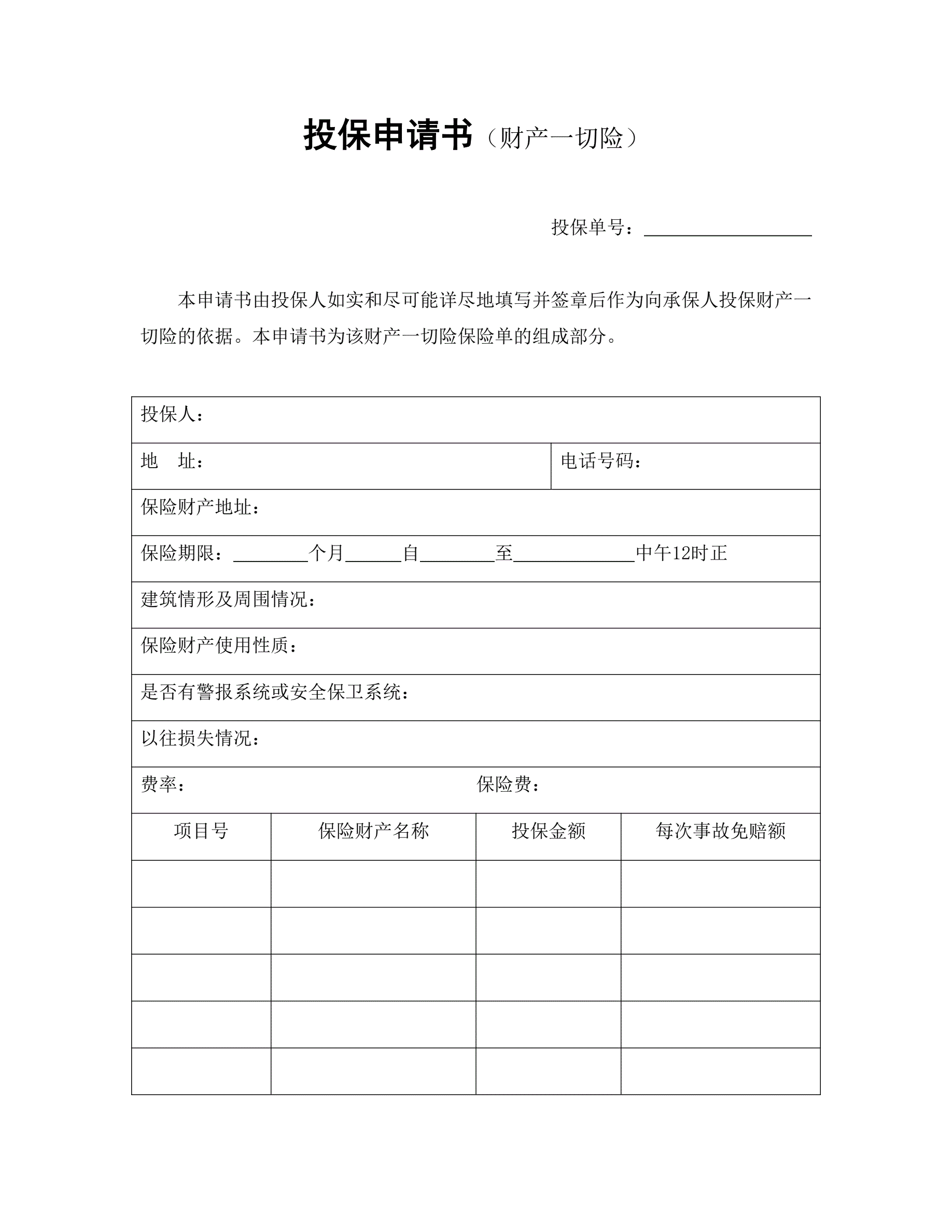 >投保申请书(财产一切险)