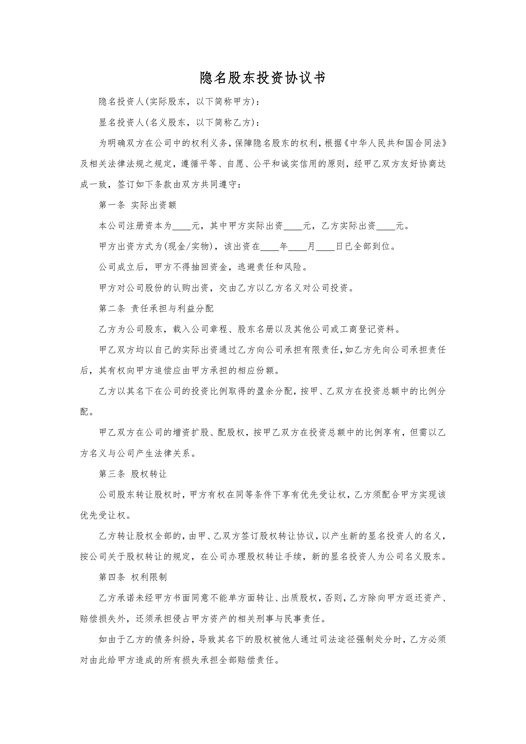 隐名股东投资协议书