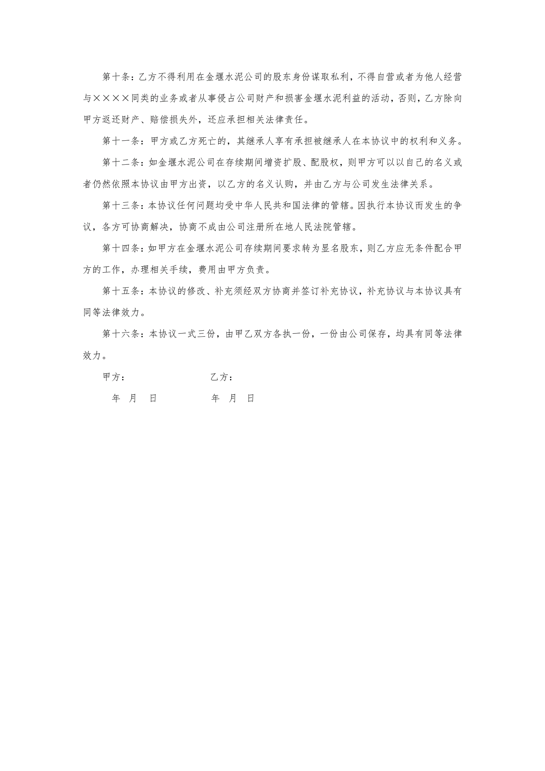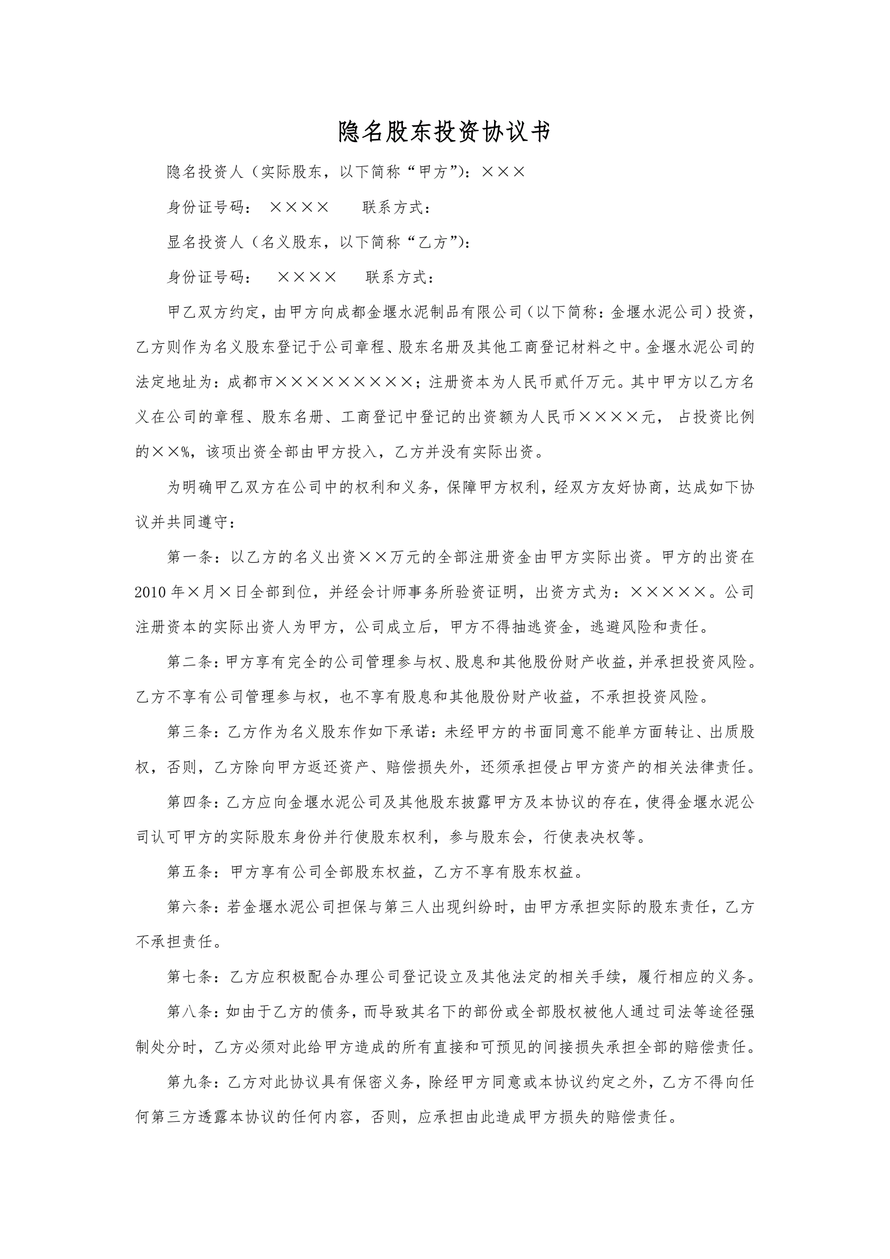 隐名股东投资协议书