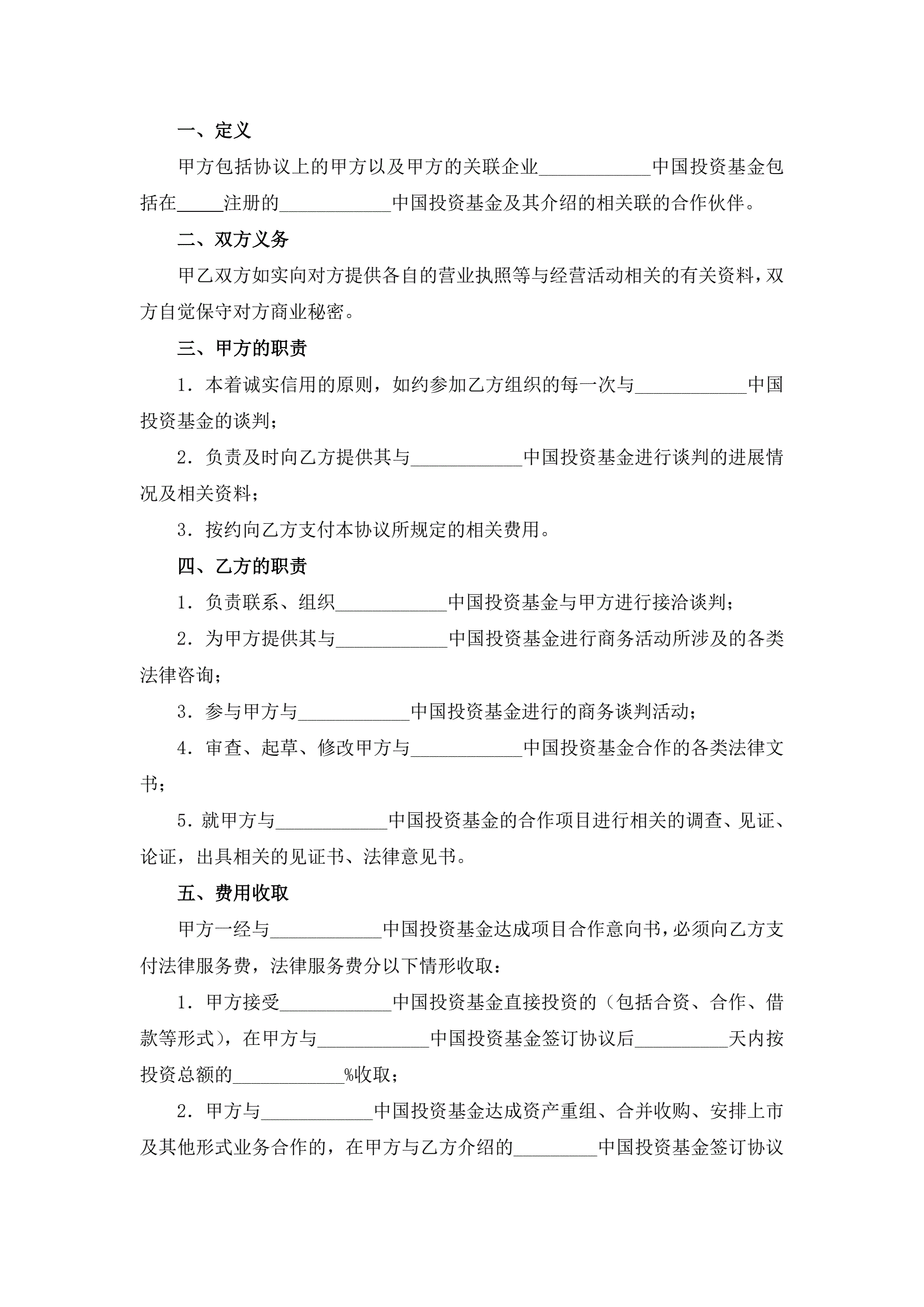 >投资基金法律服务合作协议书