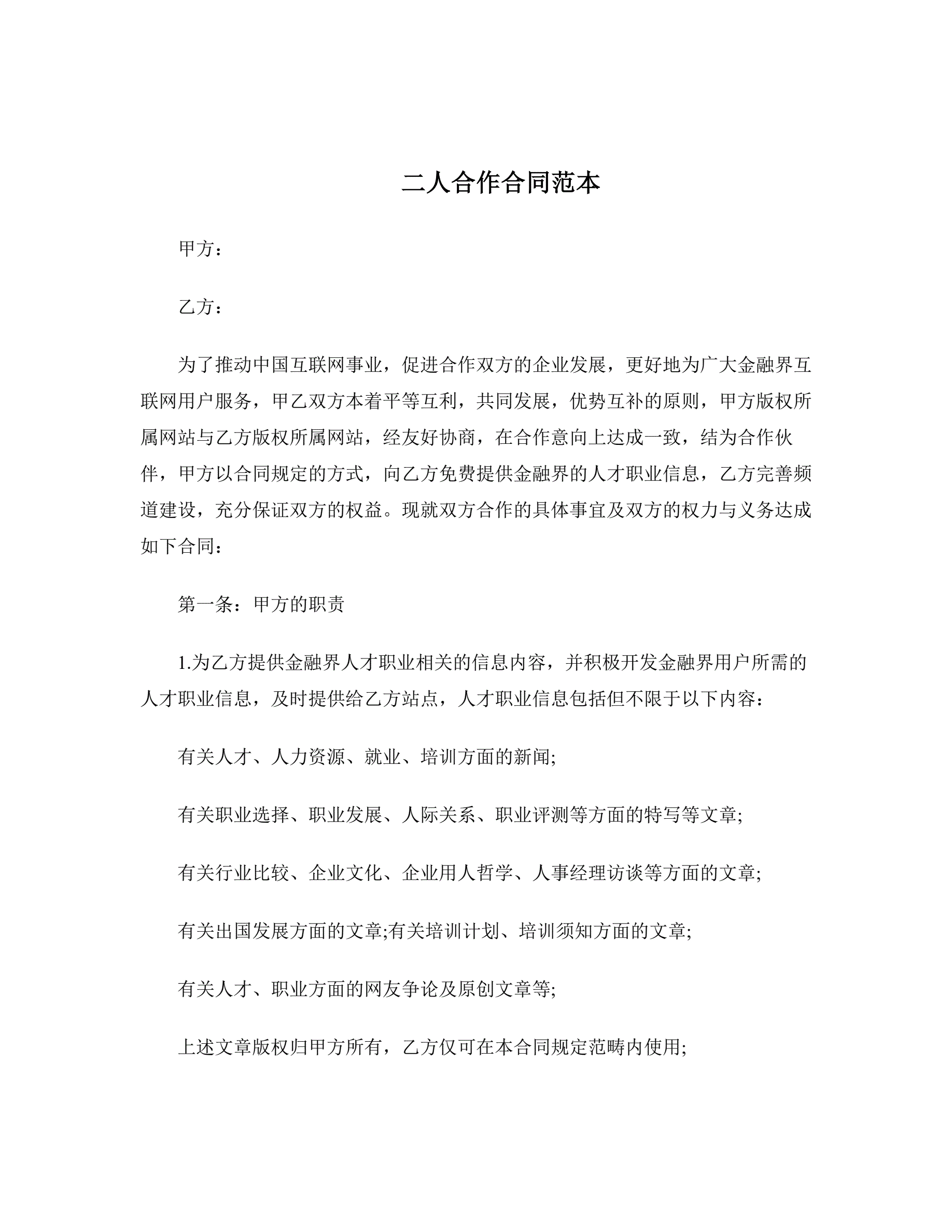 二人合作合同范本