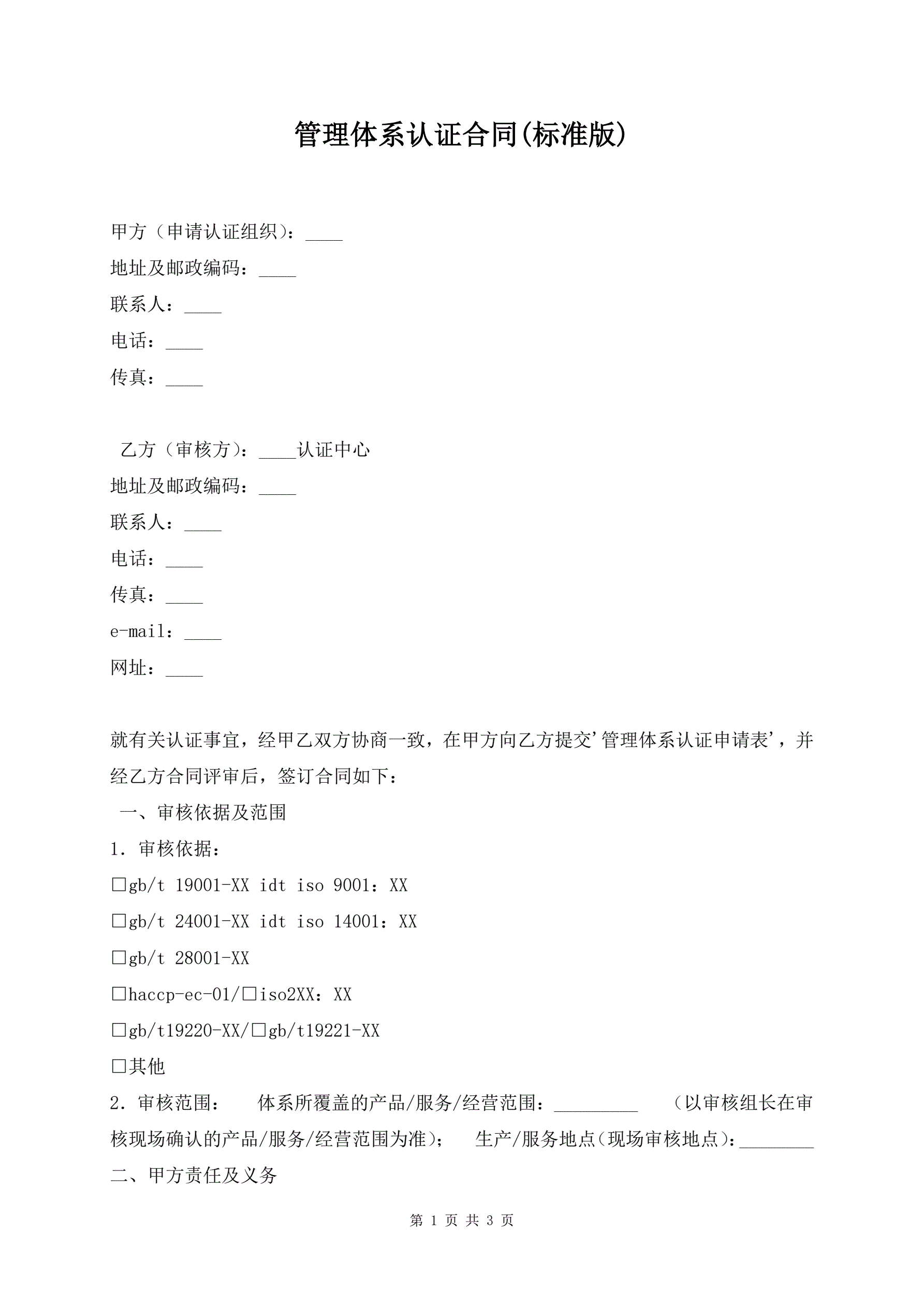 >管理体系认证合同(标准版)