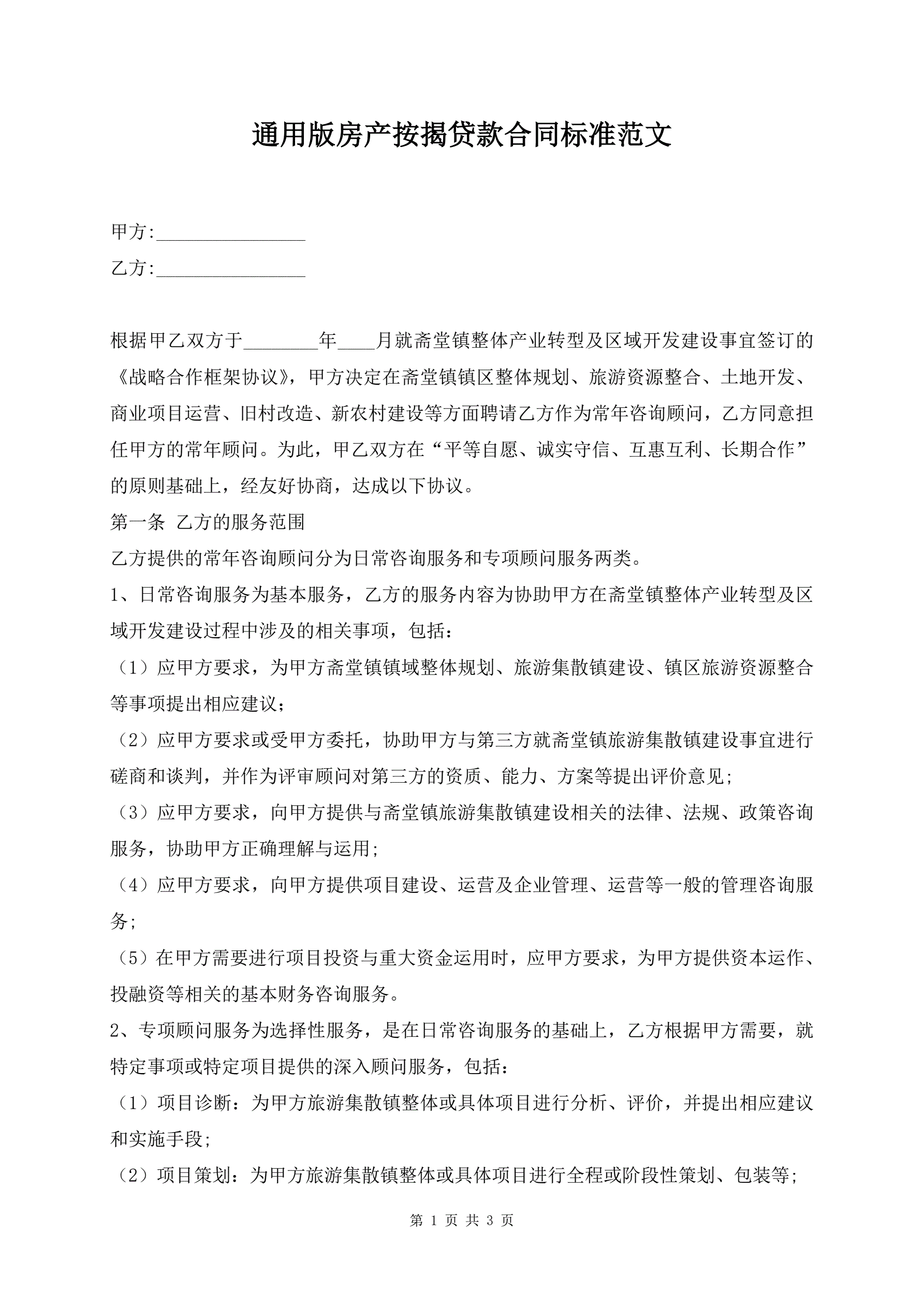 通用版房产按揭贷款合同标准范文