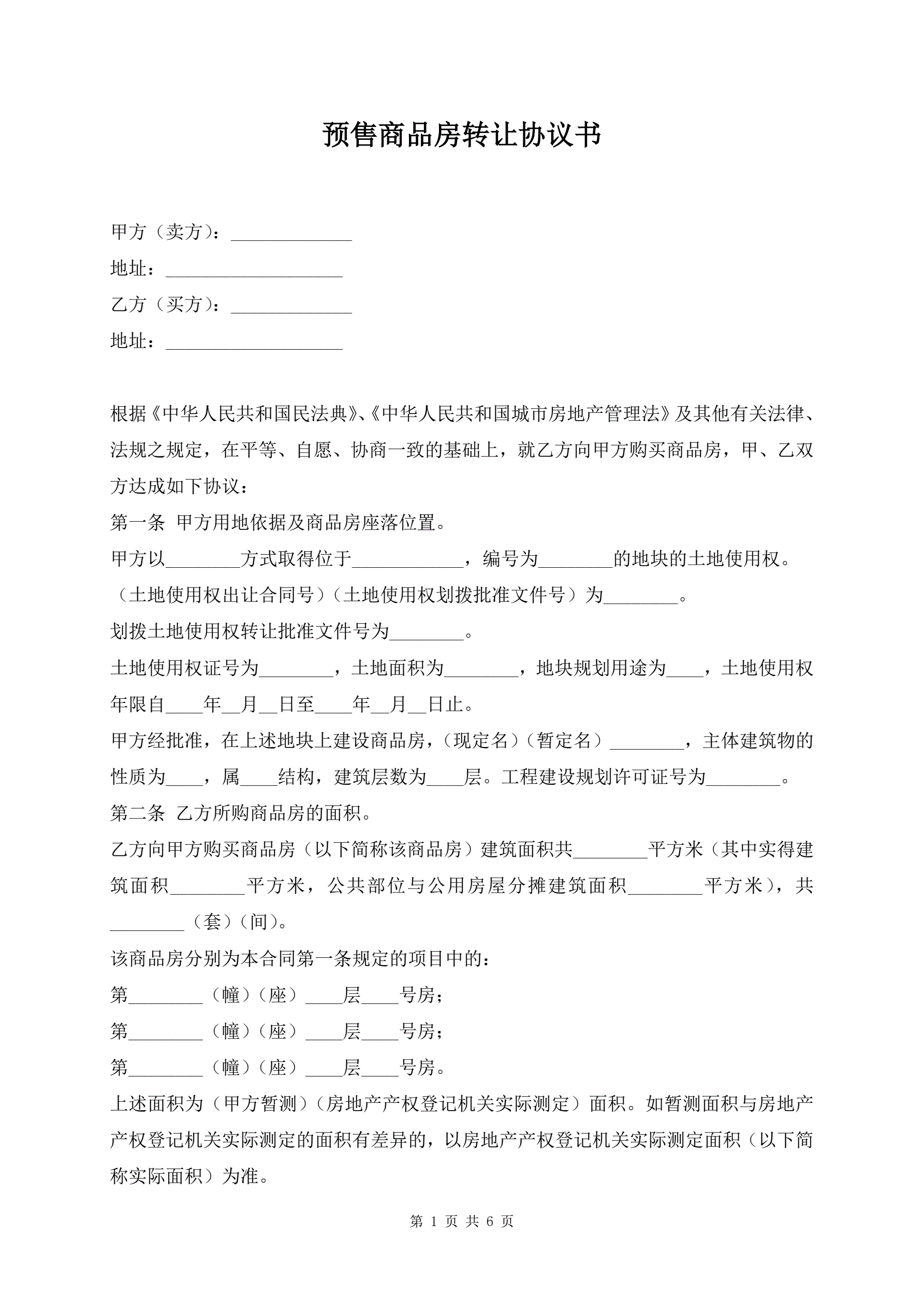 预售商品房转让协议书
