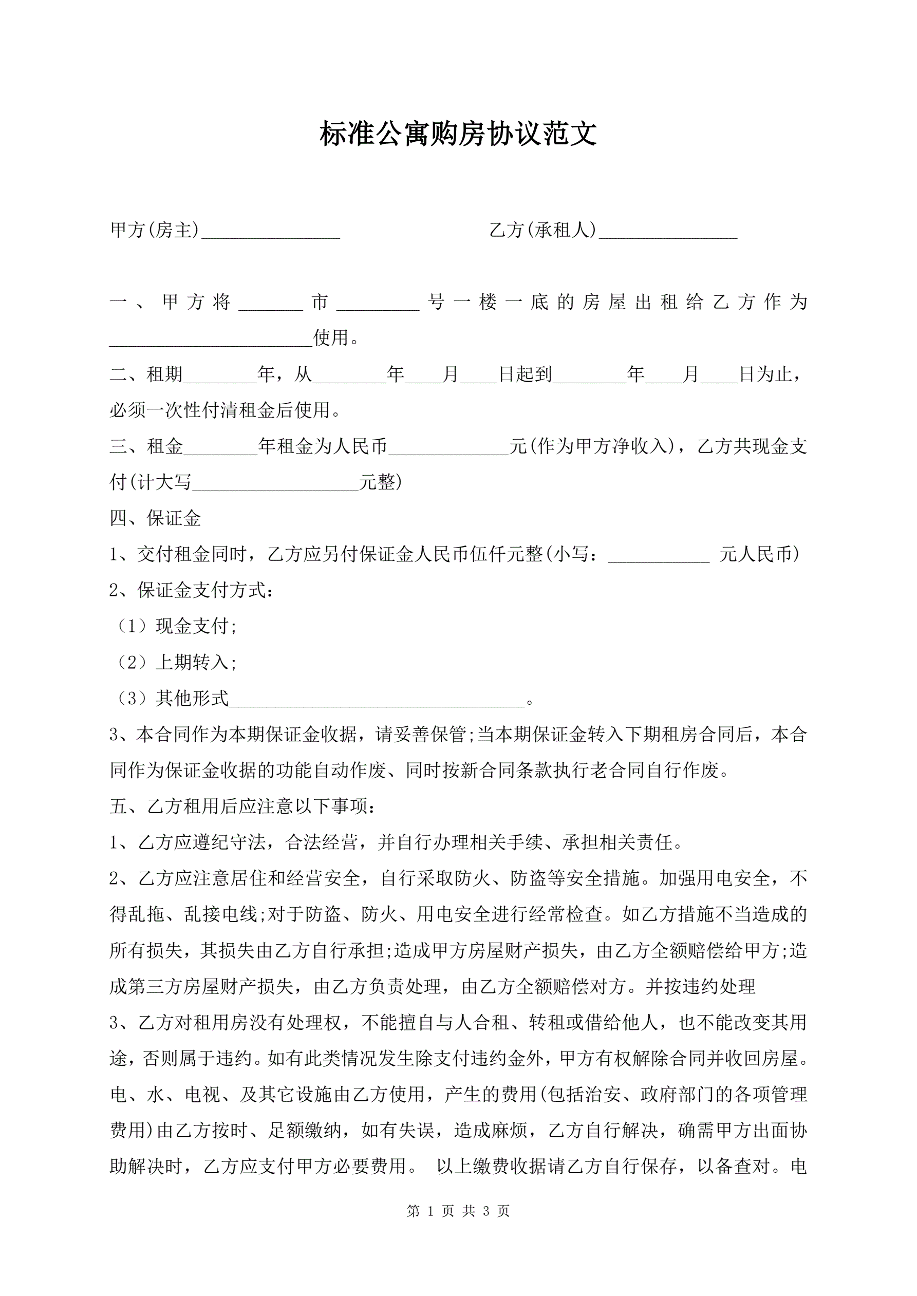 标准公寓购房协议范文