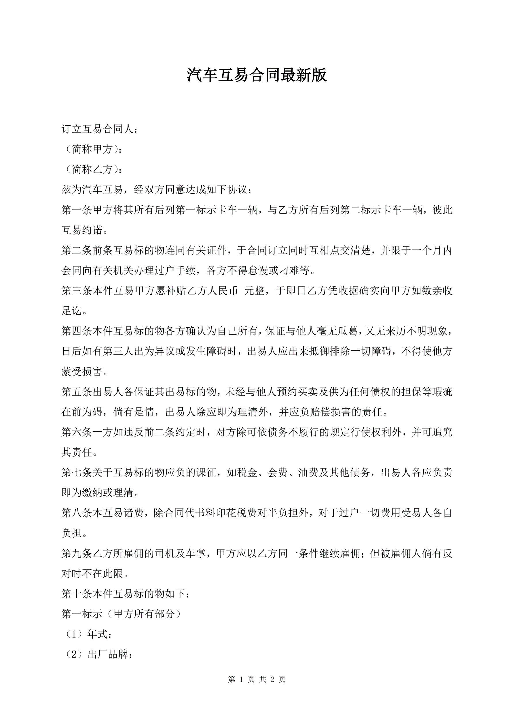 >汽车互易合同最新版