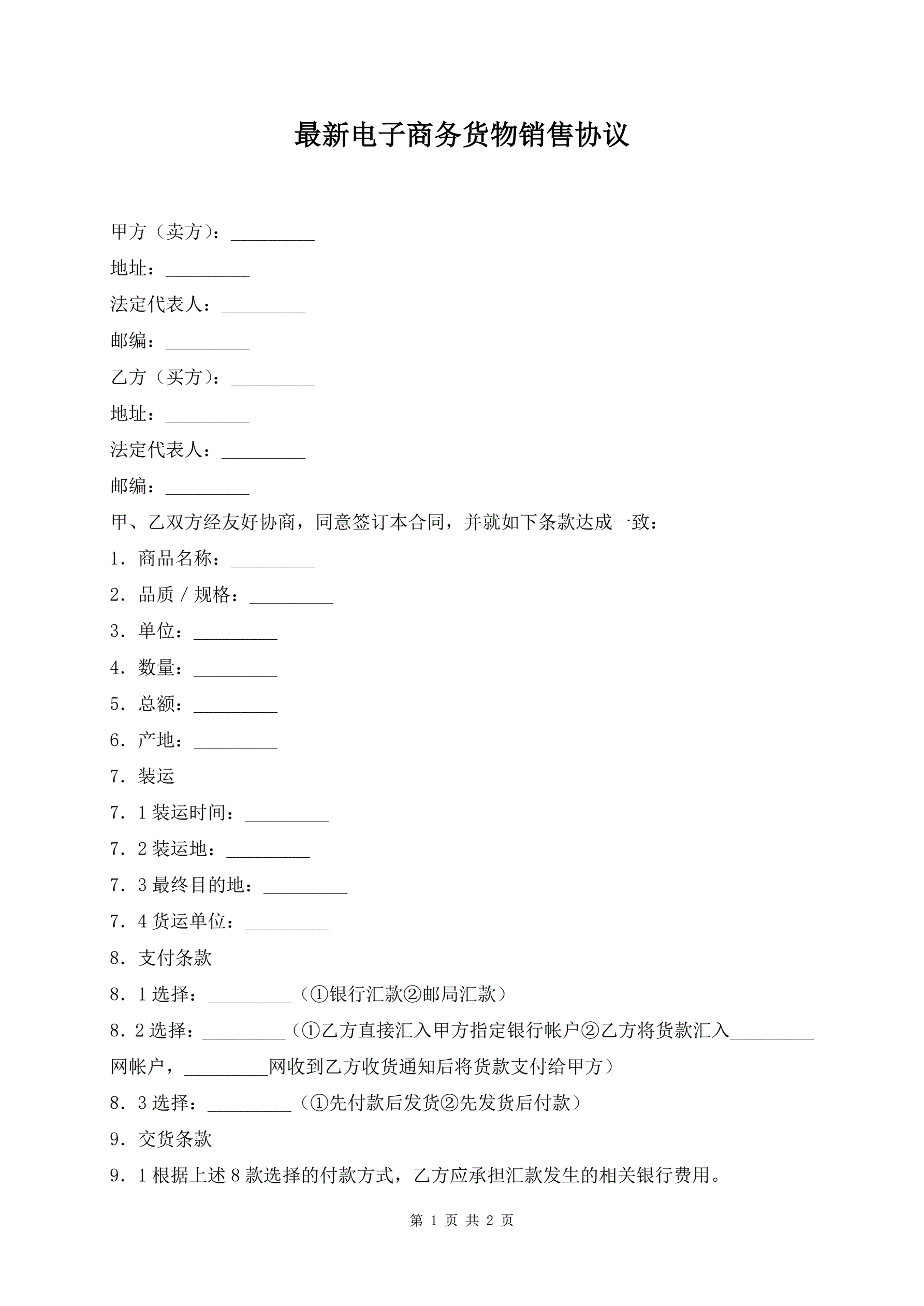 最新电子商务货物销售协议