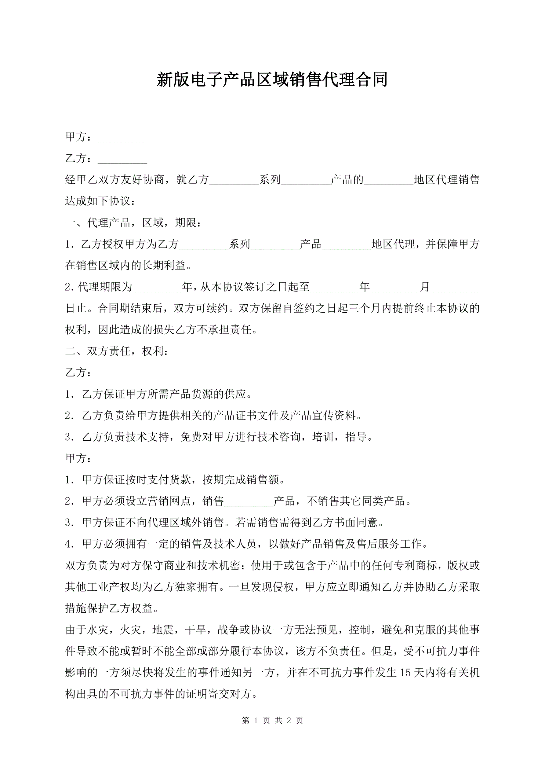 >新版电子产品区域销售代理合同