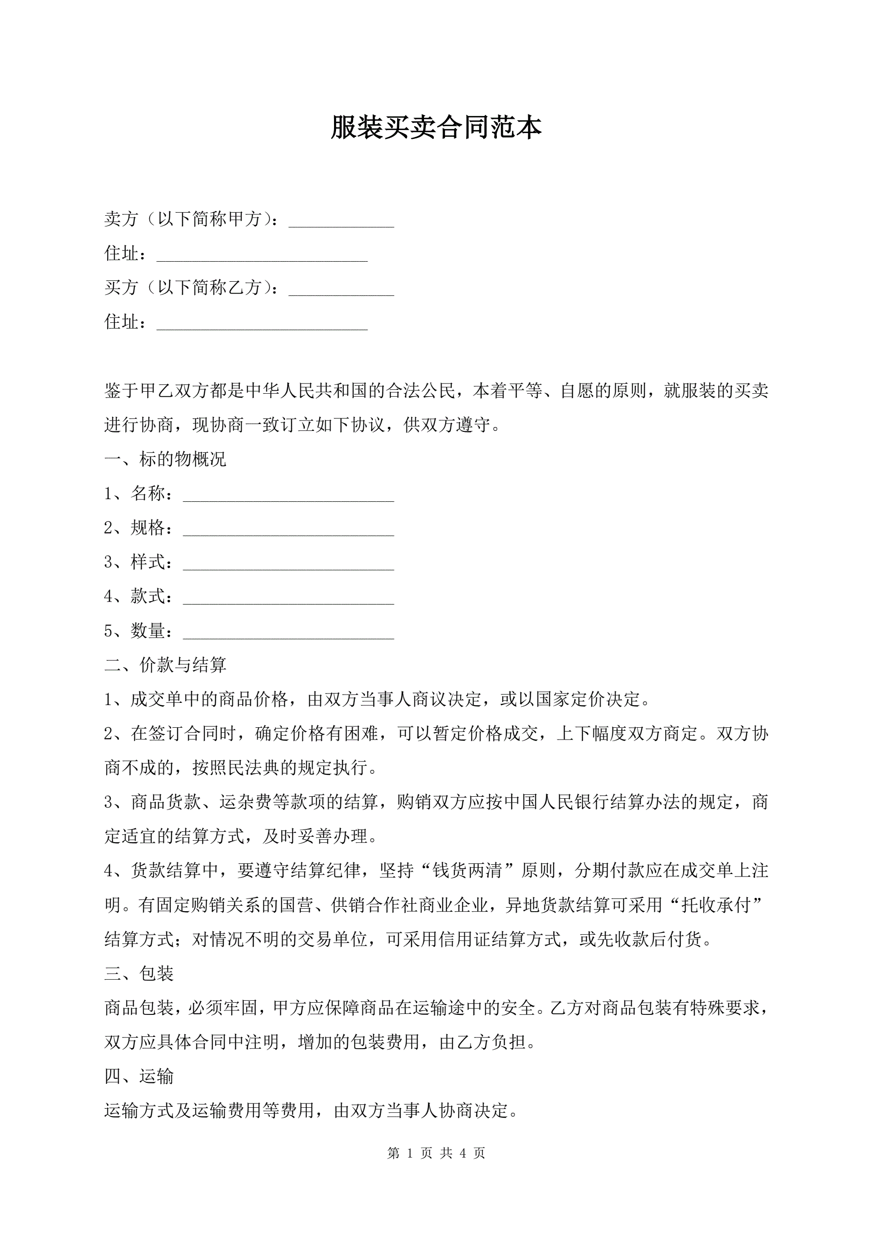 服装买卖合同范本