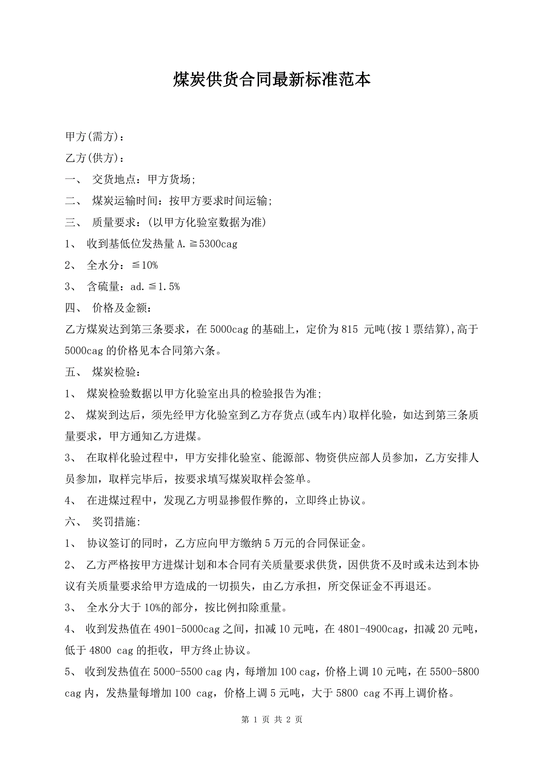 煤炭供货合同最新标准范本