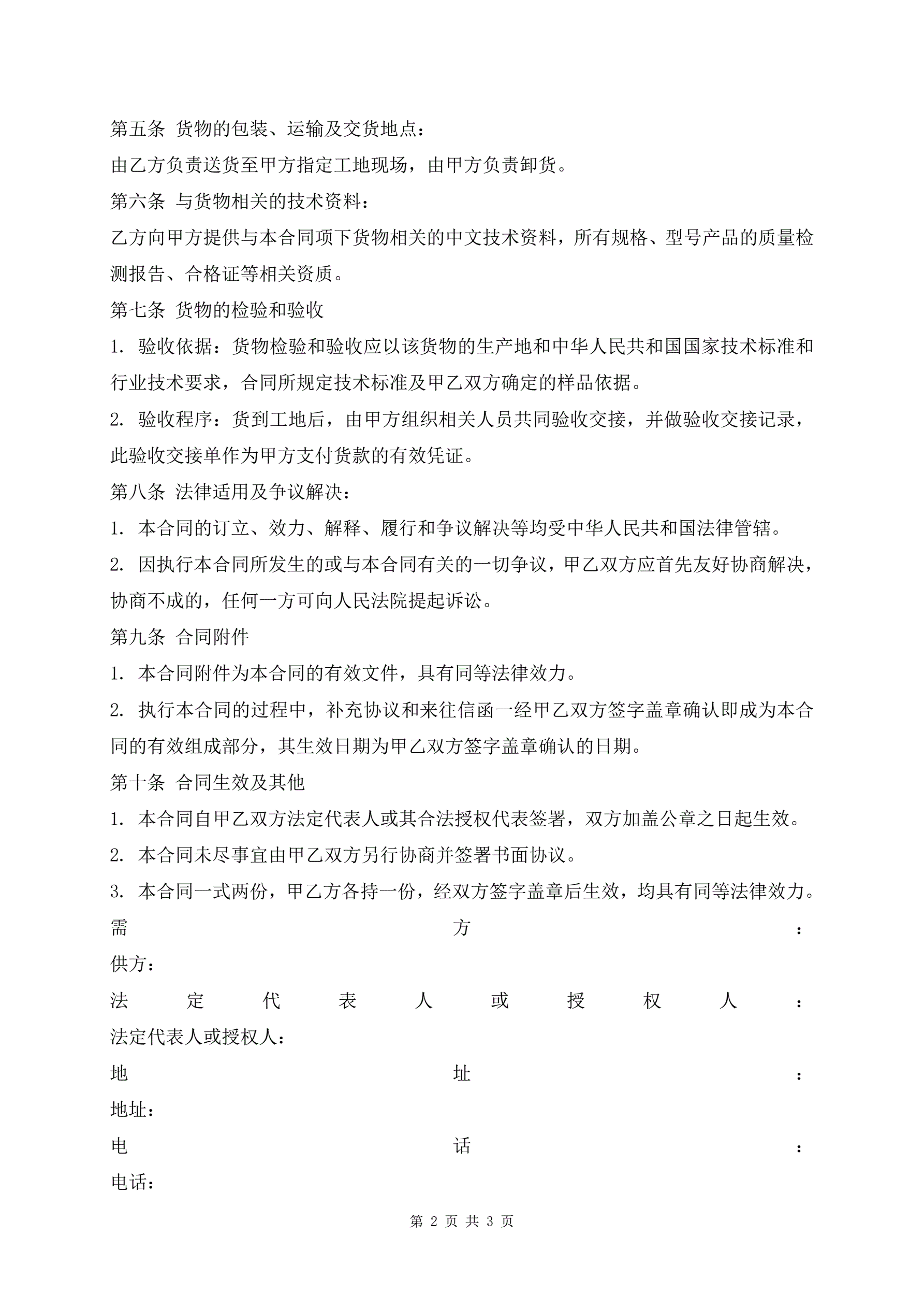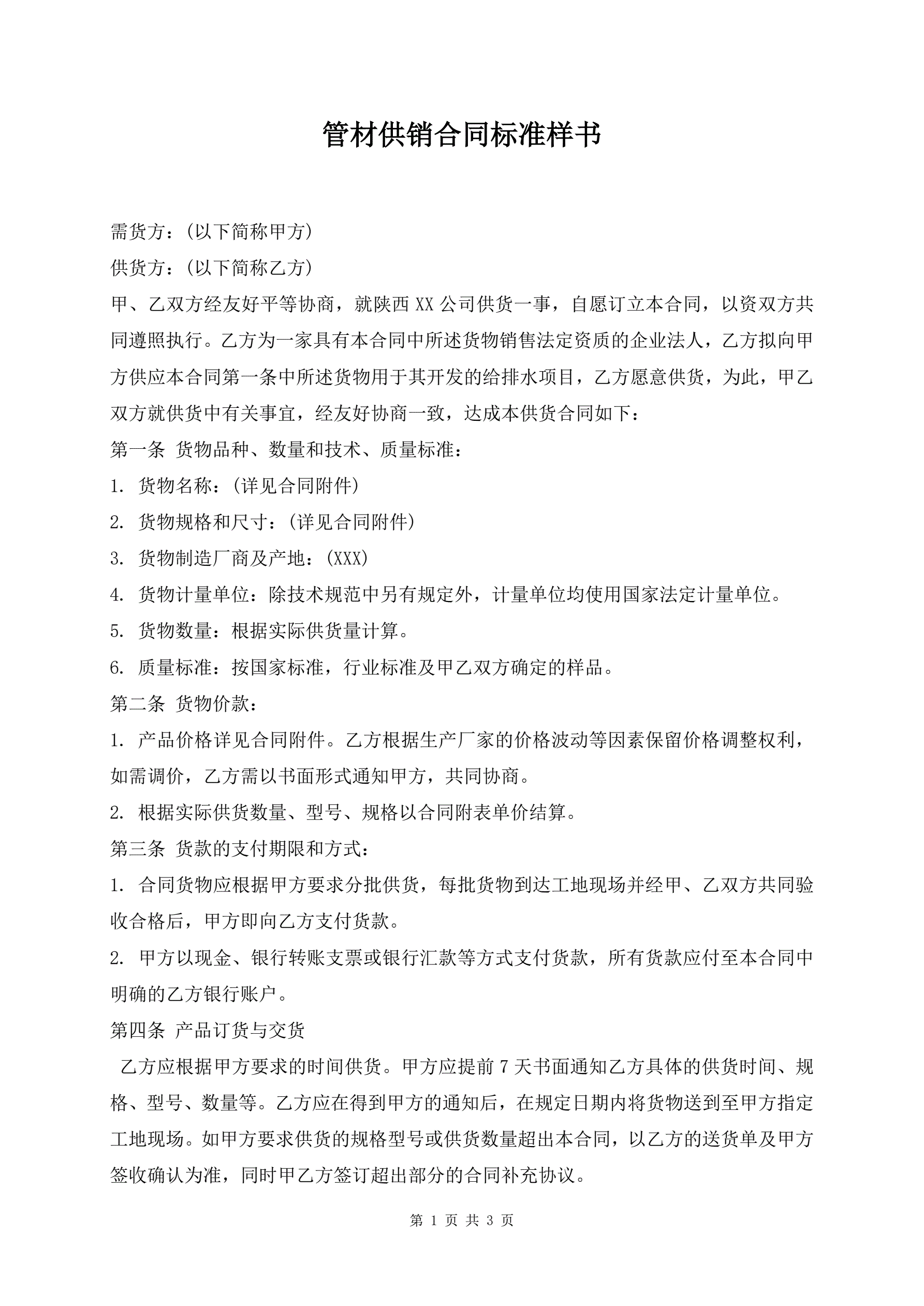 >管材供销合同标准样书