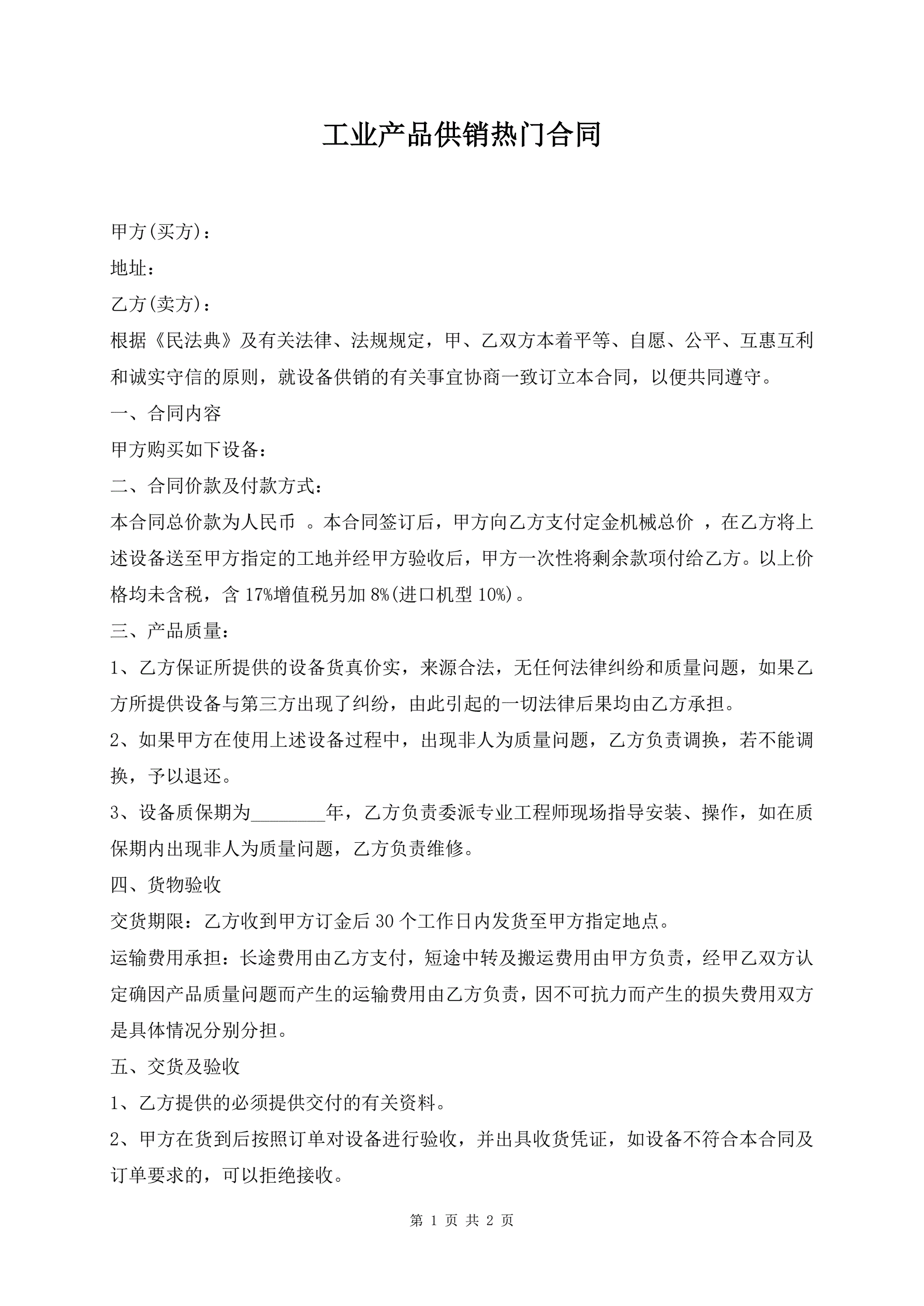 工业产品供销热门合同