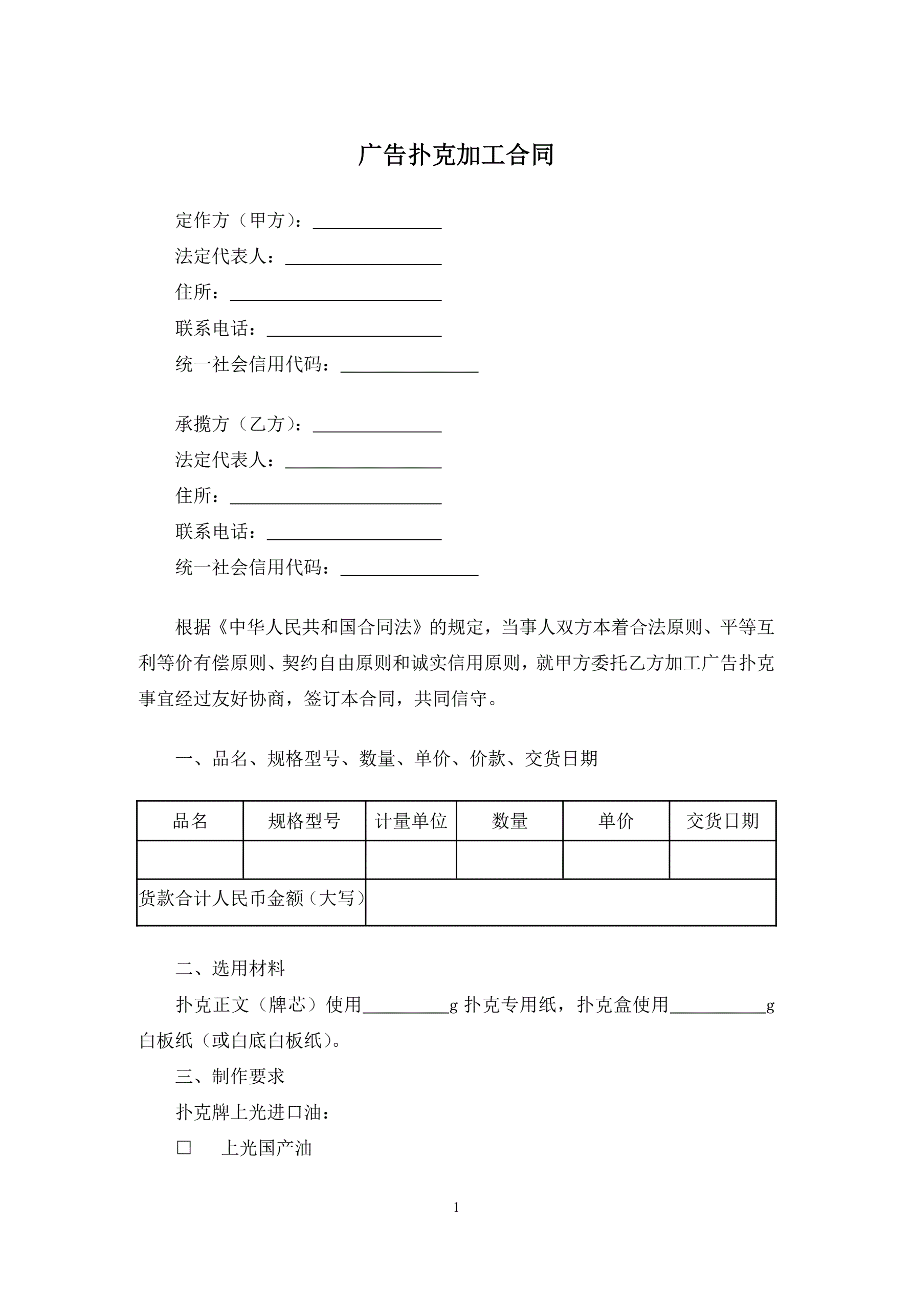>广告扑克加工合同