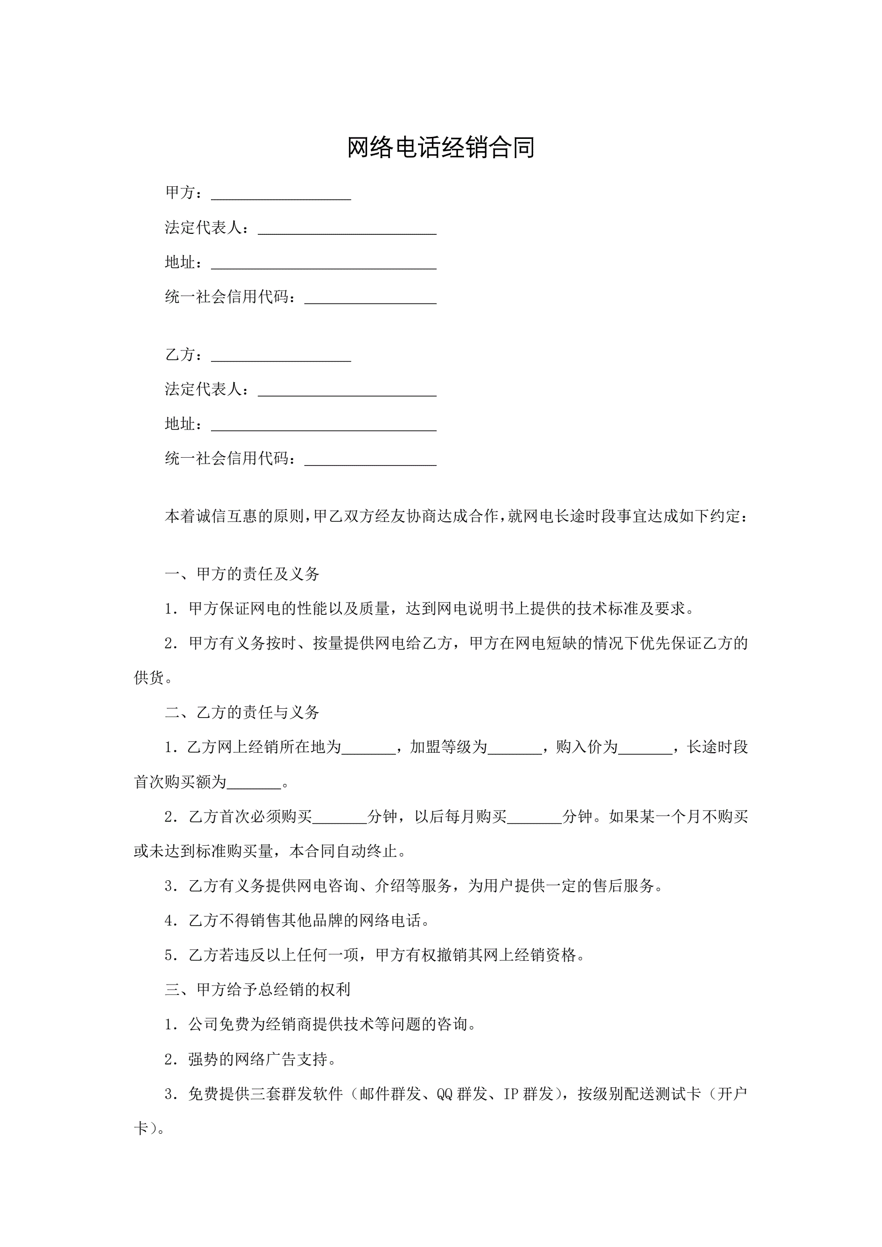 网络电话经销合同