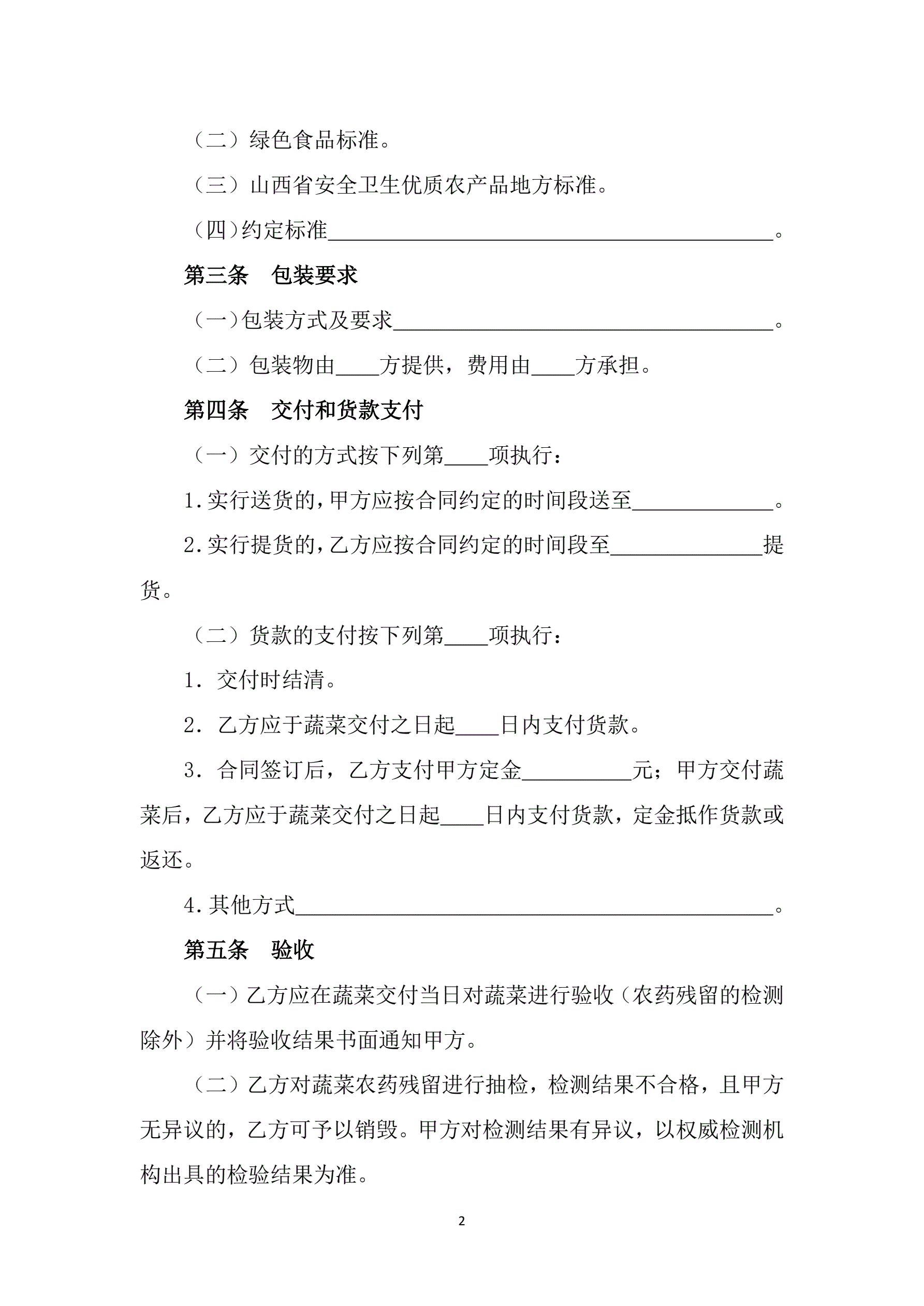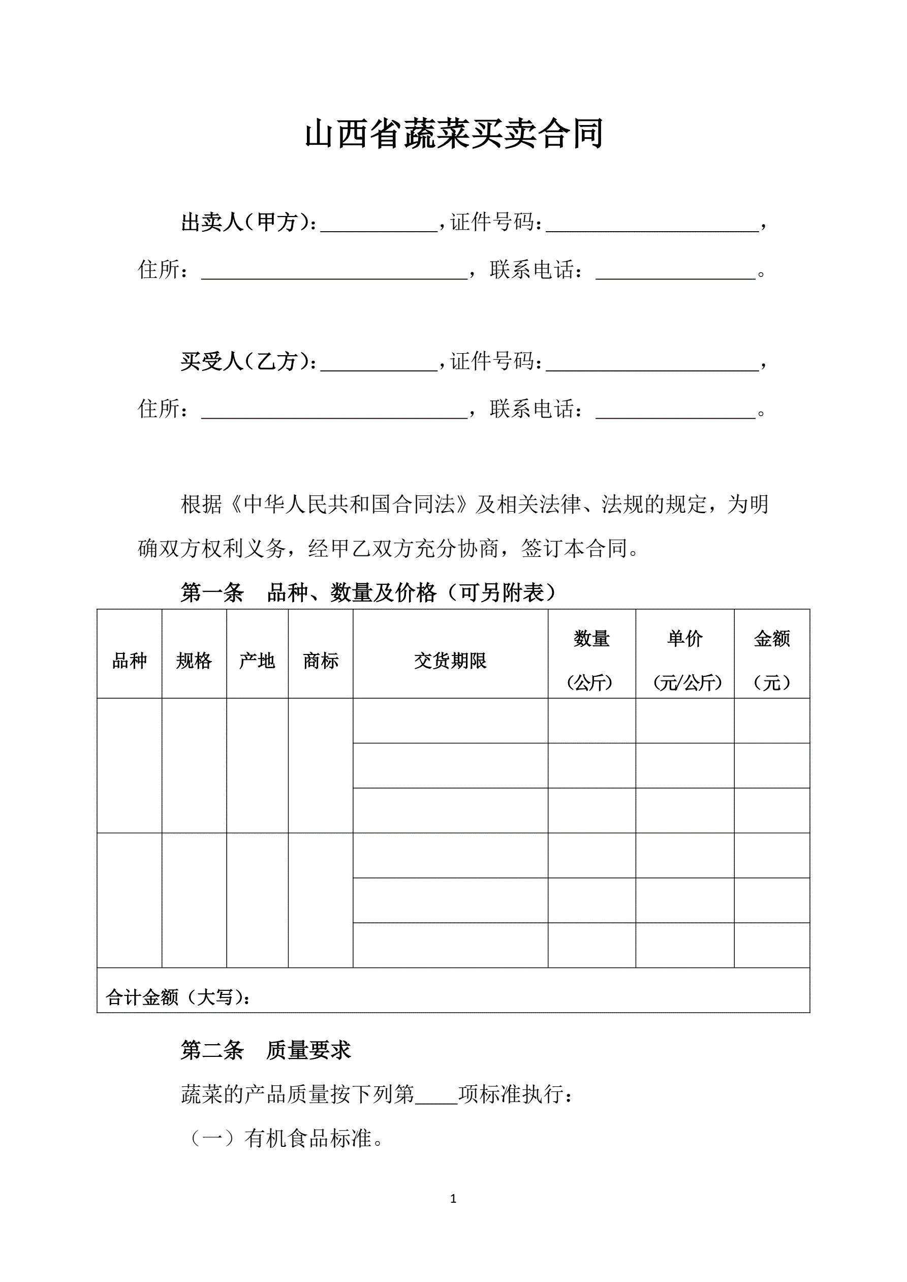 山西省蔬菜买卖合同