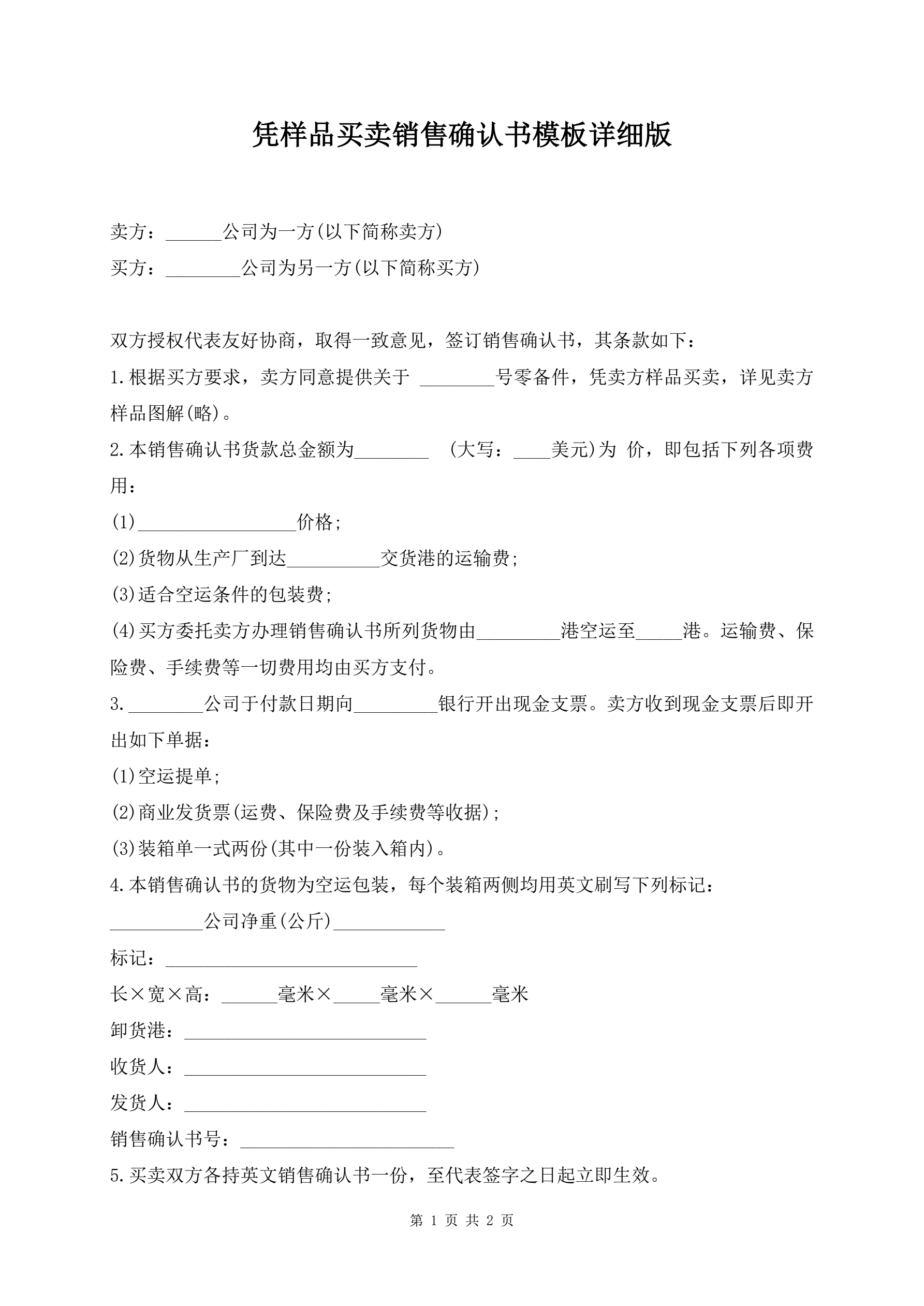 >凭样品买卖销售确认书模板详细版
