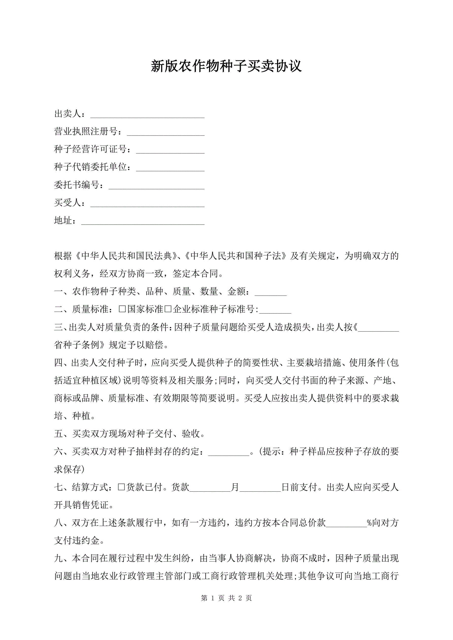 新版农作物种子买卖协议