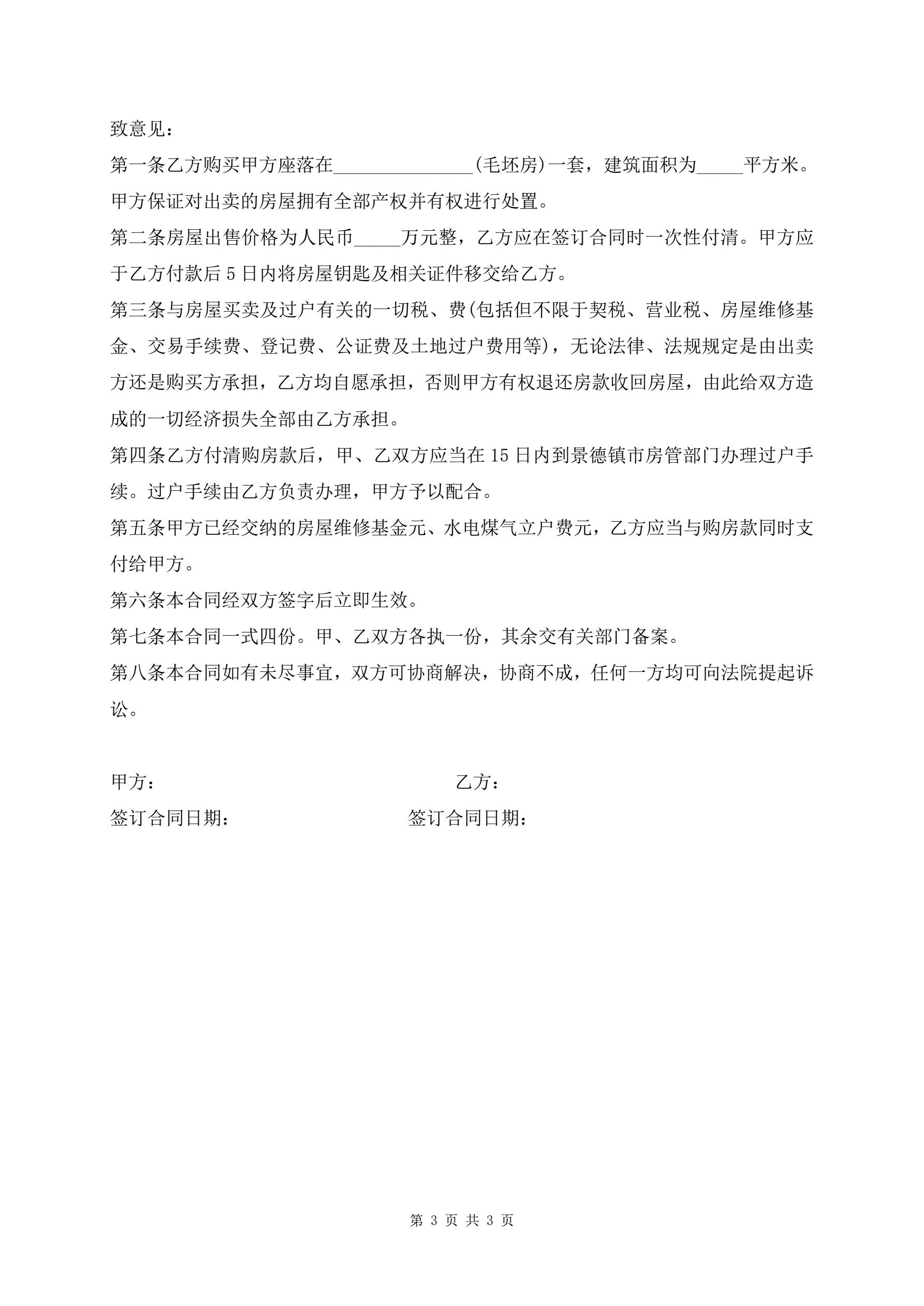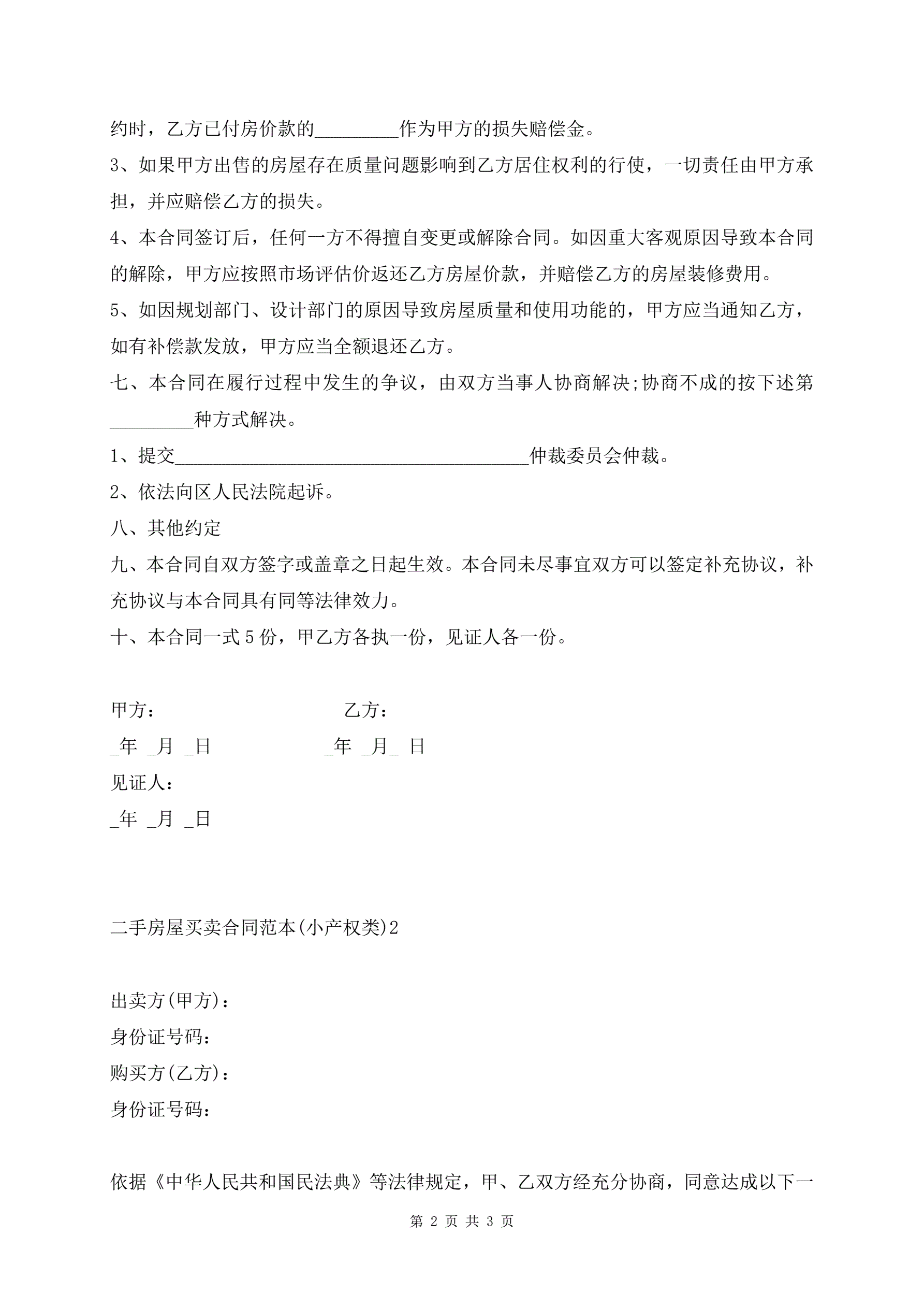 二手房屋买卖合同范本(小产权类)