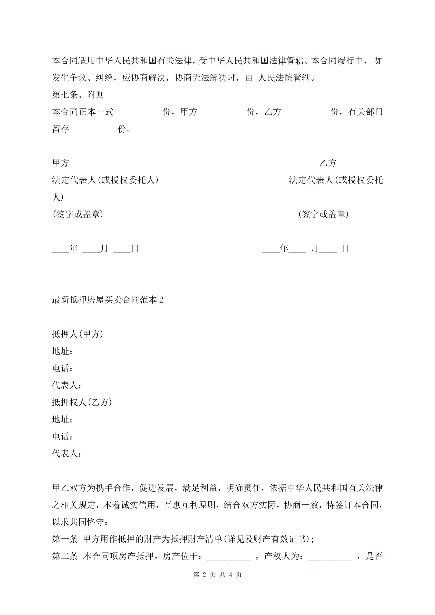 最新抵押房屋买卖合同范本