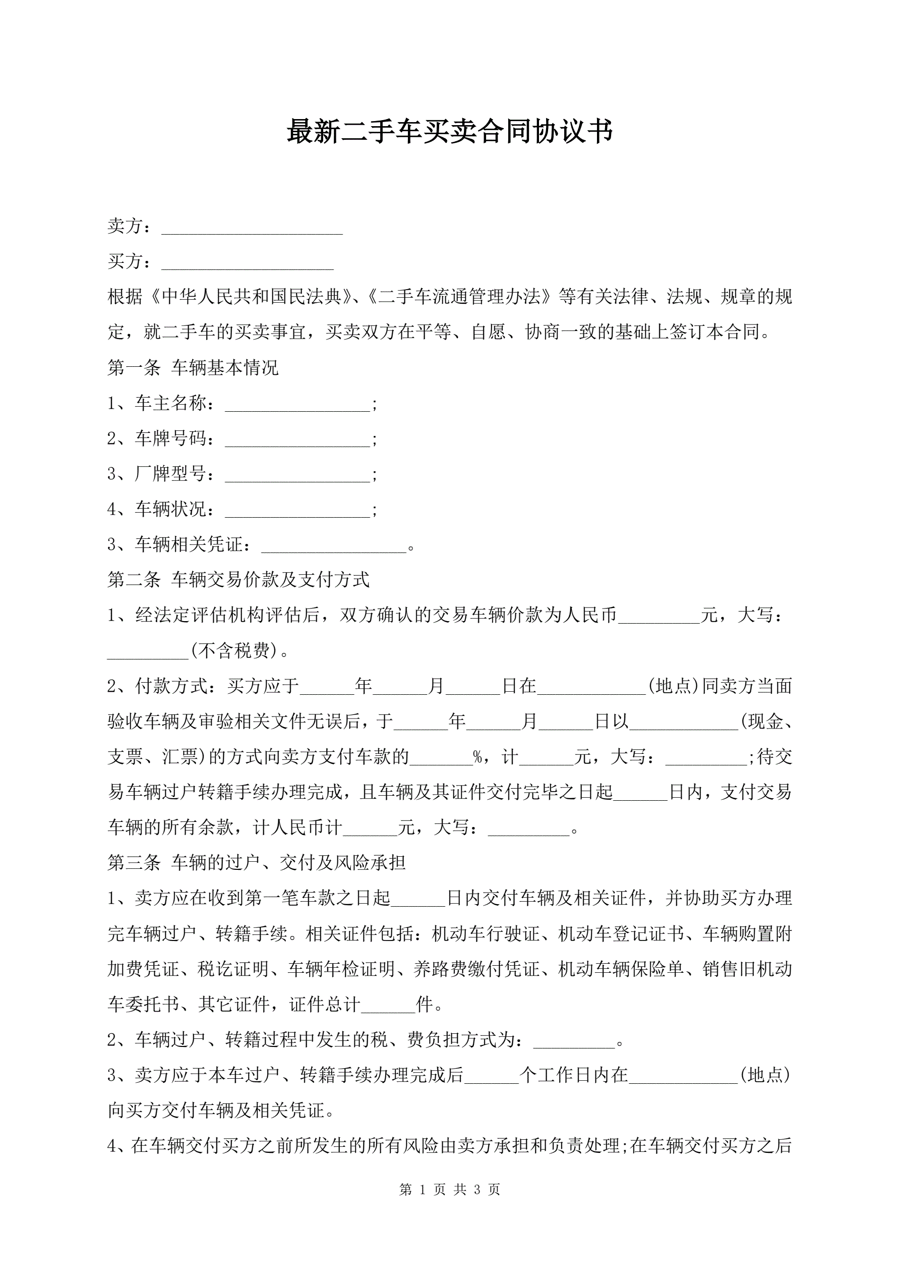 >最新二手车买卖合同协议书