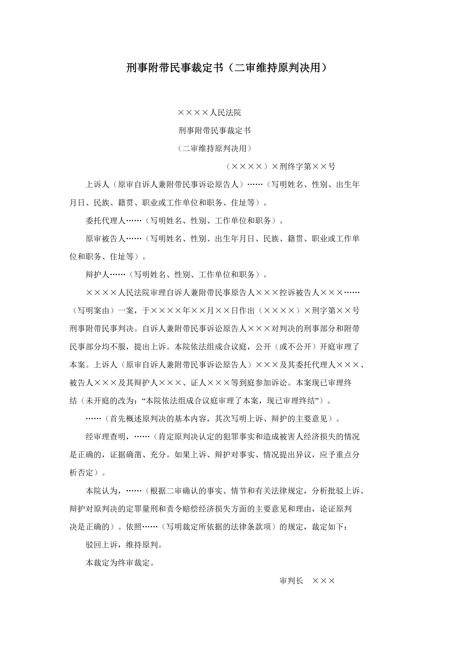 刑事附带民事裁定书(二审维持原判决用)