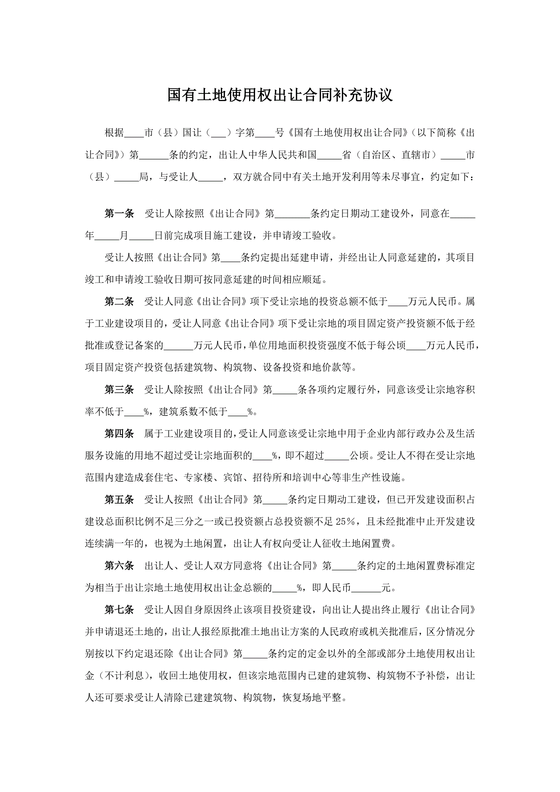 国有土地使用权出让合同补充协议