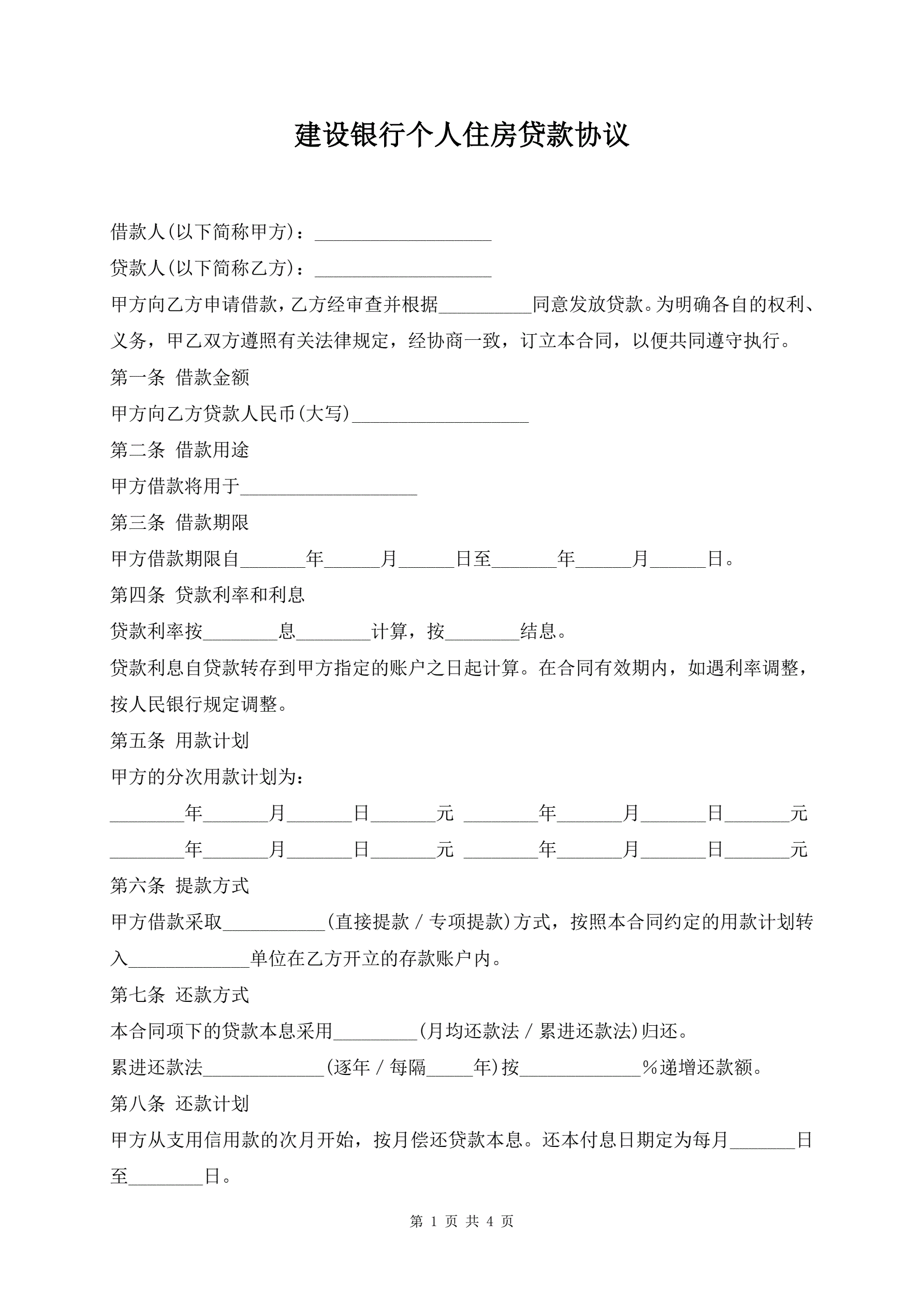 >建设银行个人住房贷款协议
