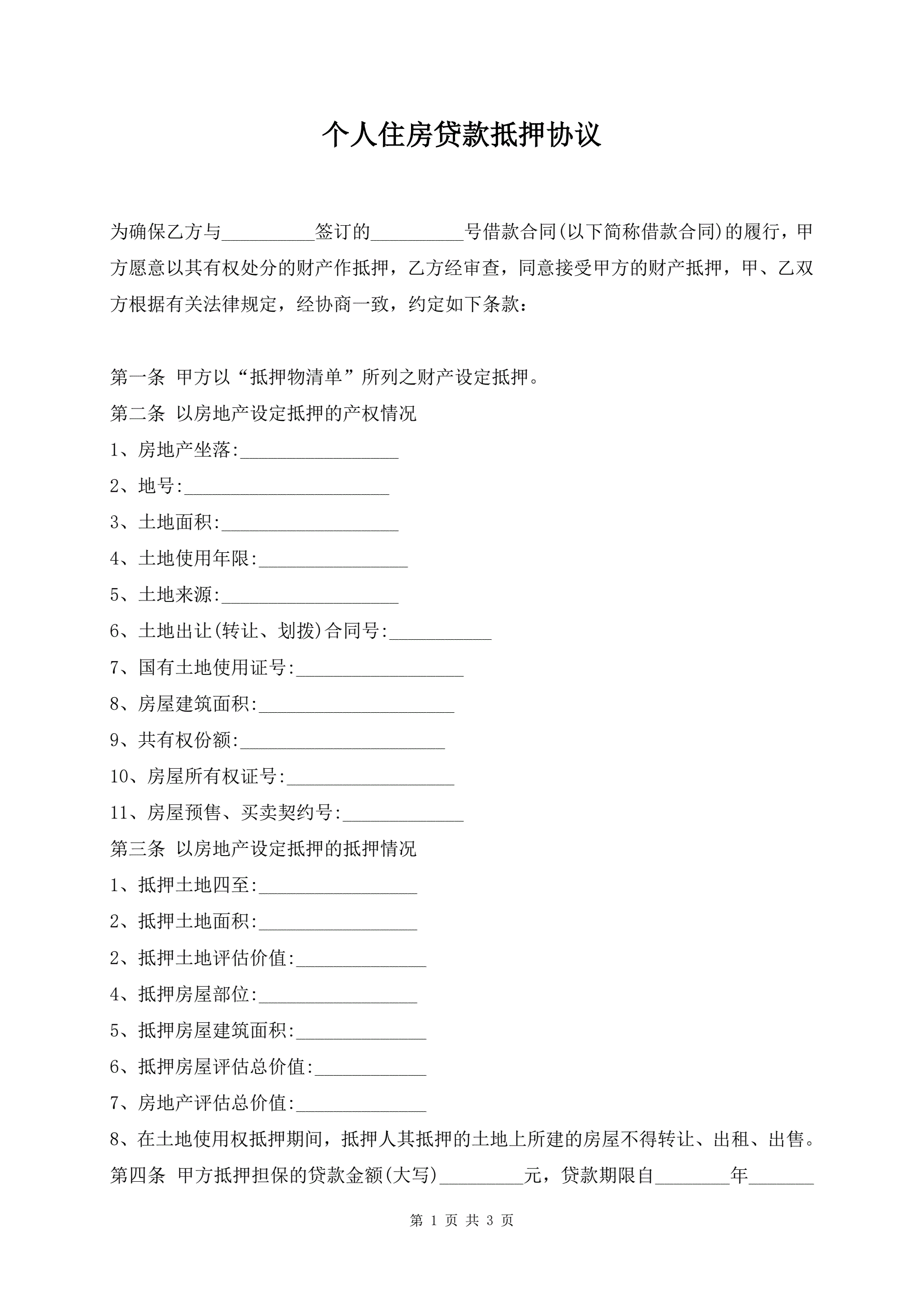 >个人住房贷款抵押协议