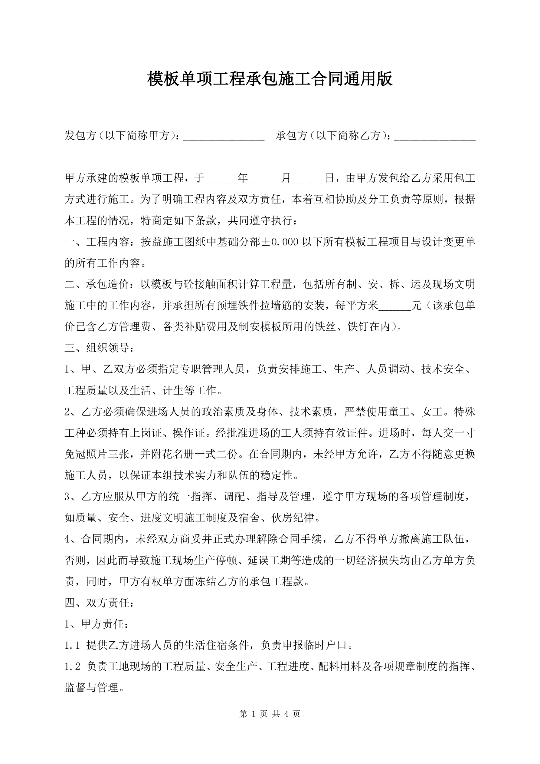 模板单项工程承包施工合同通用版