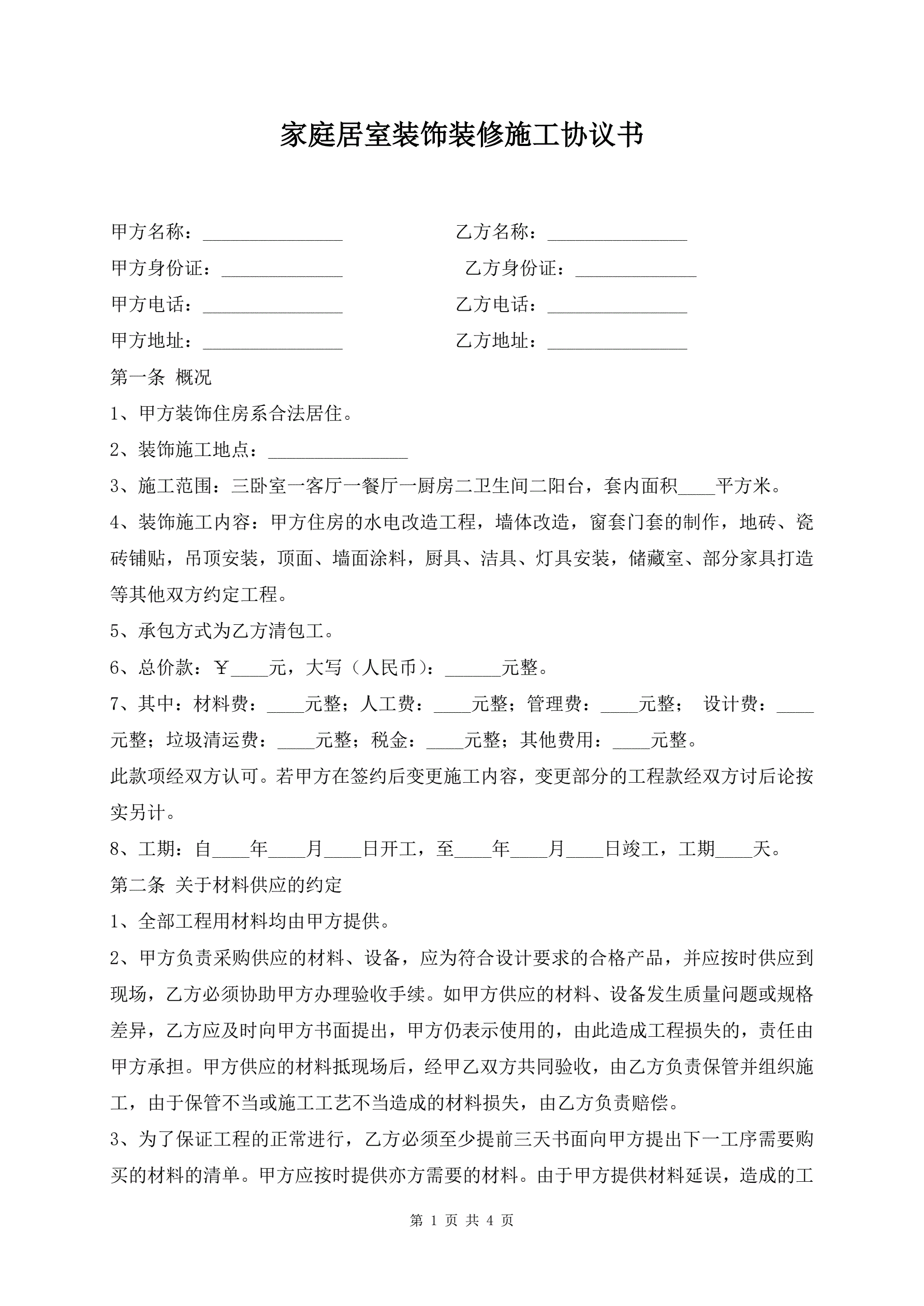 >家庭居室装饰装修施工协议书