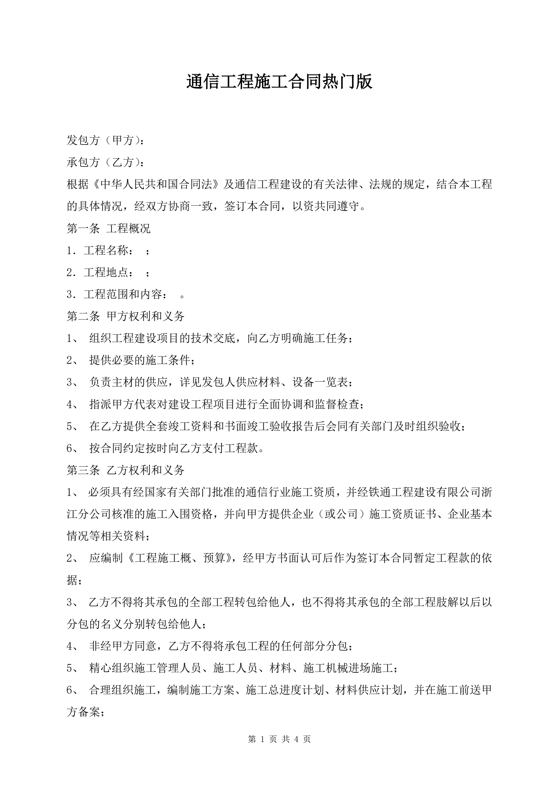 通信工程施工合同热门版