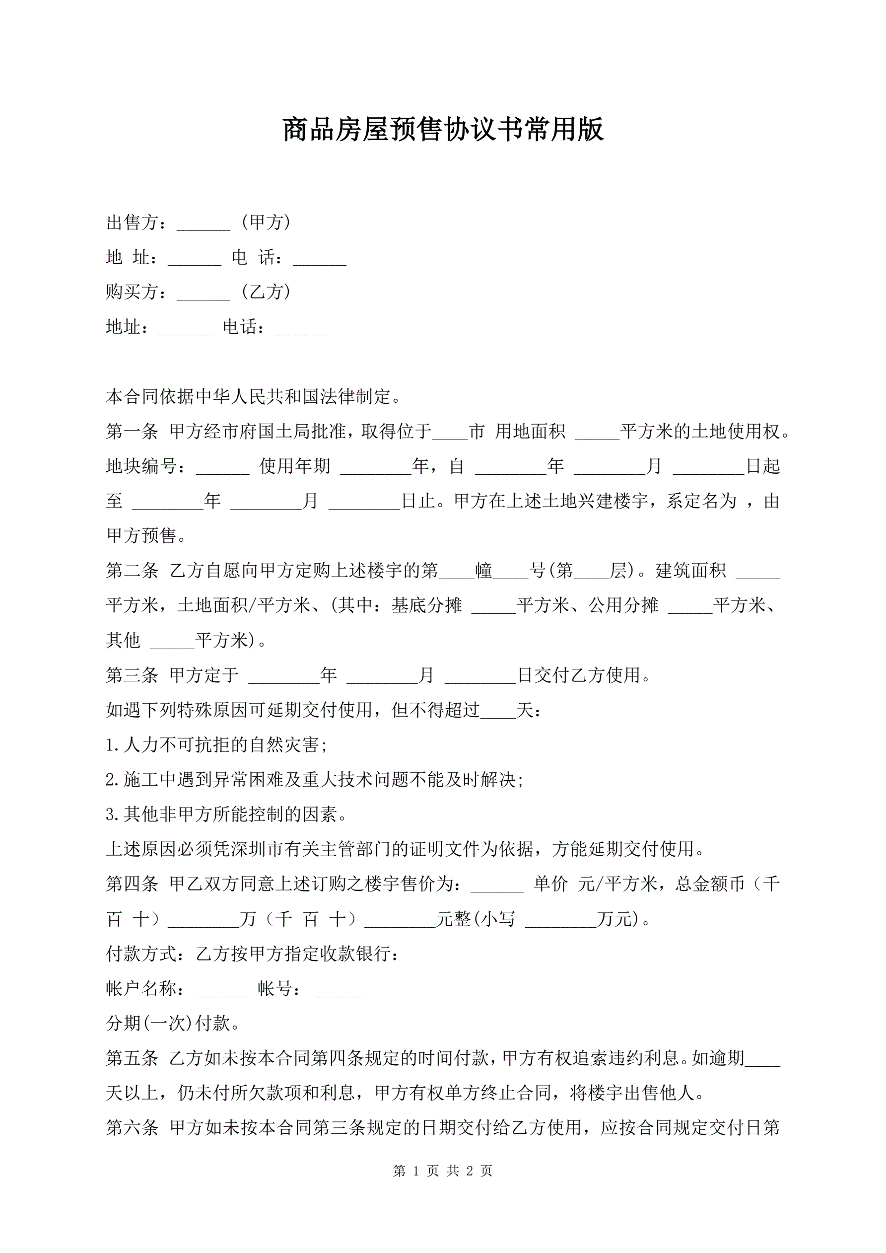 商品房屋预售协议书常用版