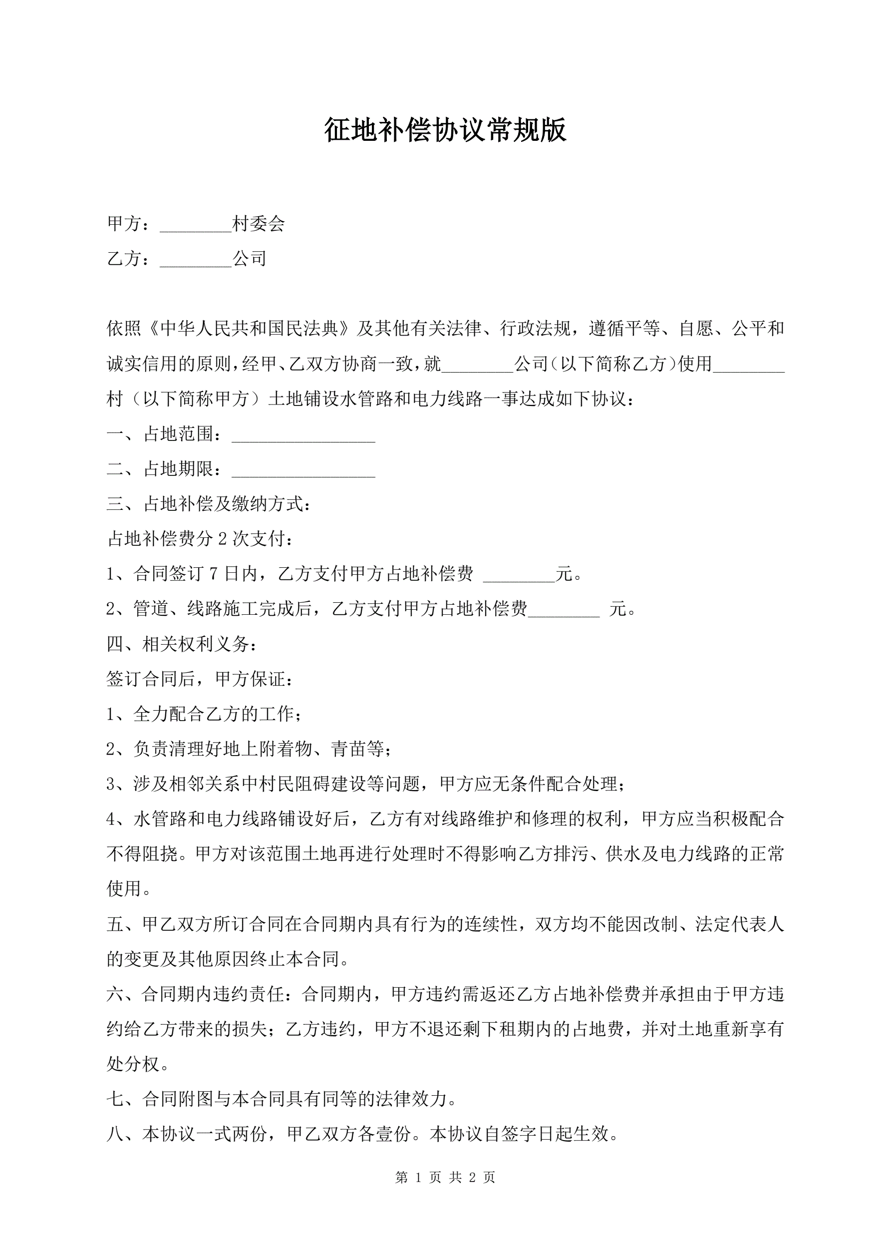 征地补偿协议常规版