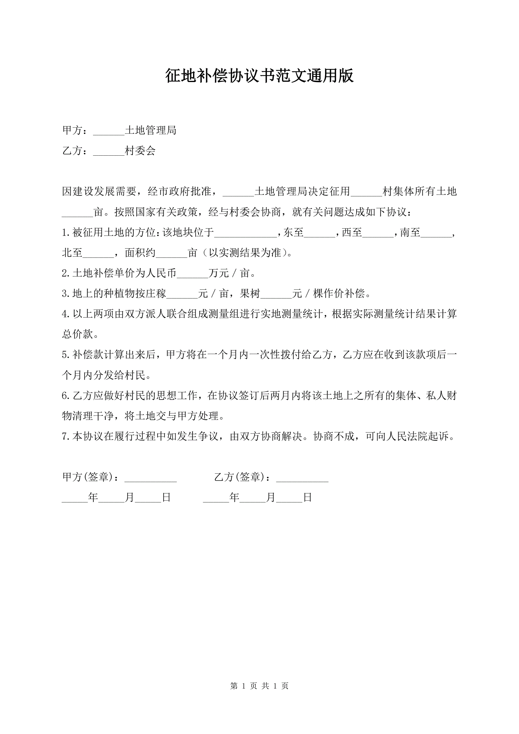 征地补偿协议书范文通用版