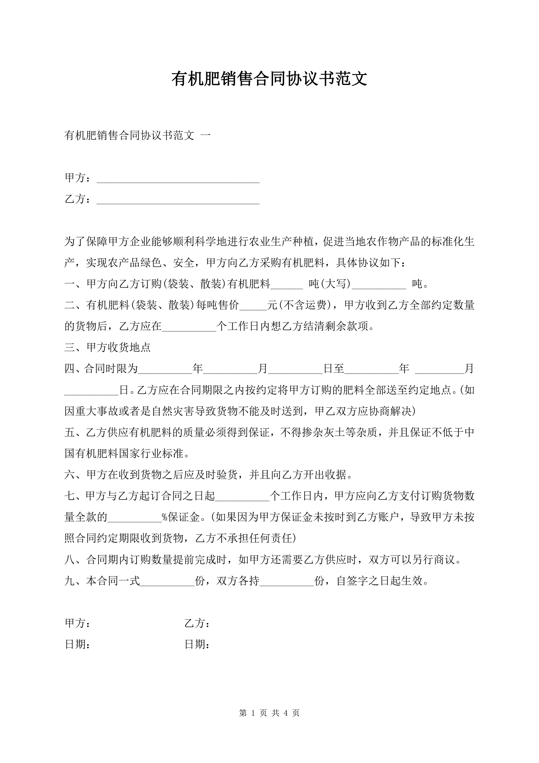 >有机肥销售合同协议书范文
