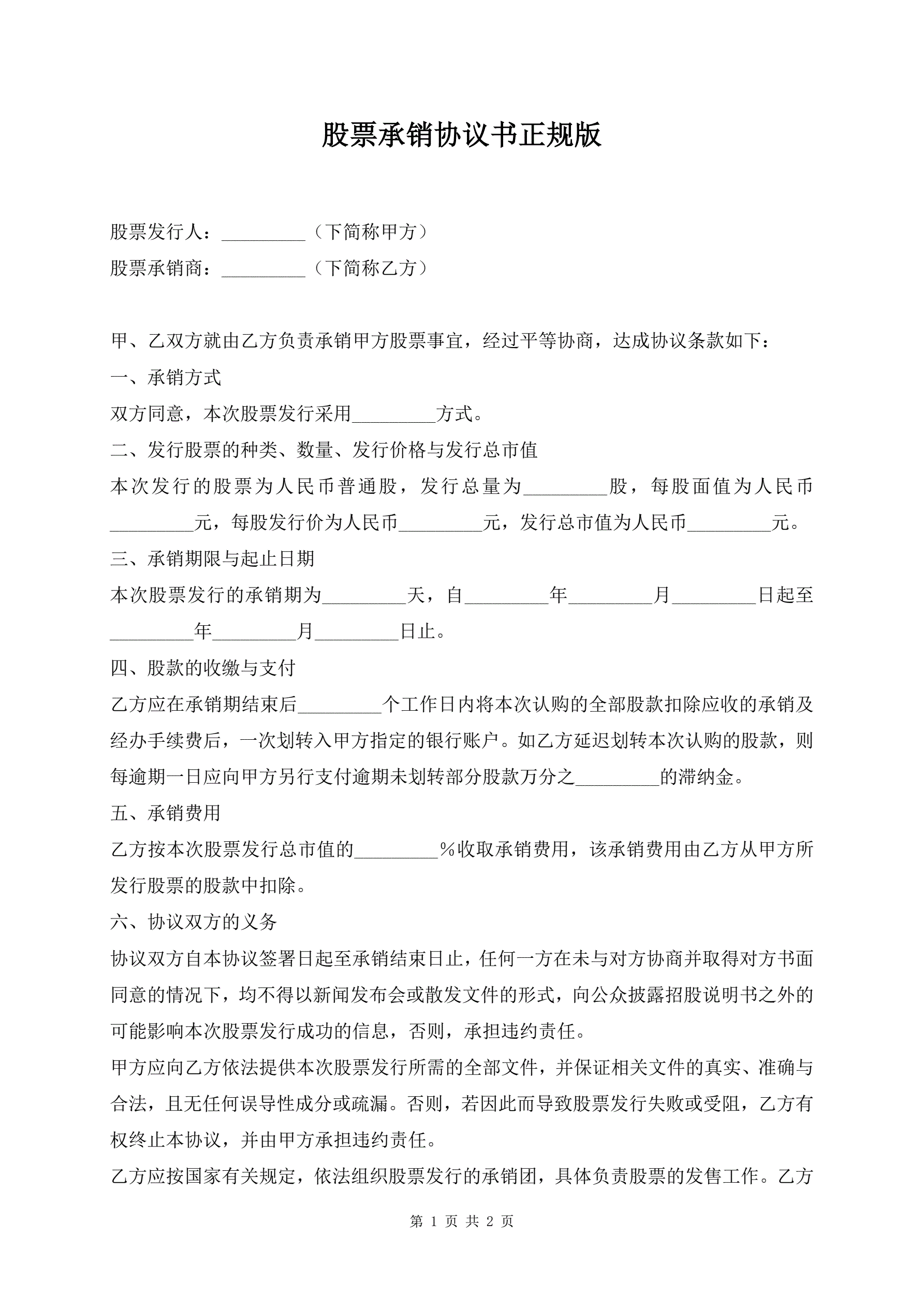 >股票承销协议书正规版