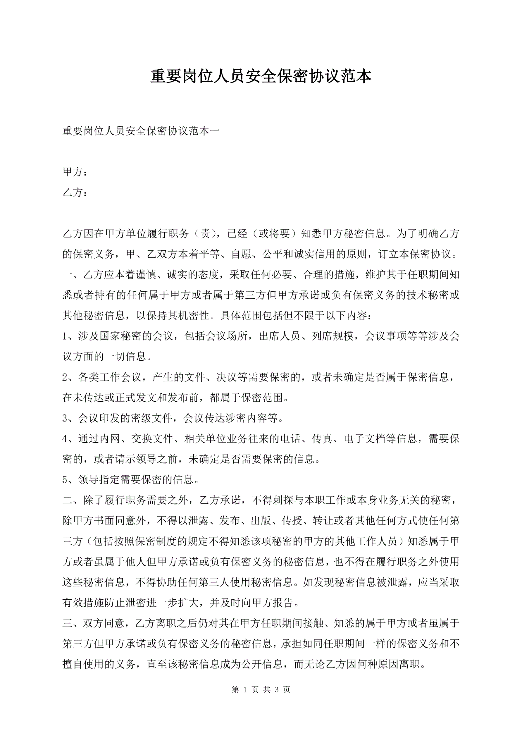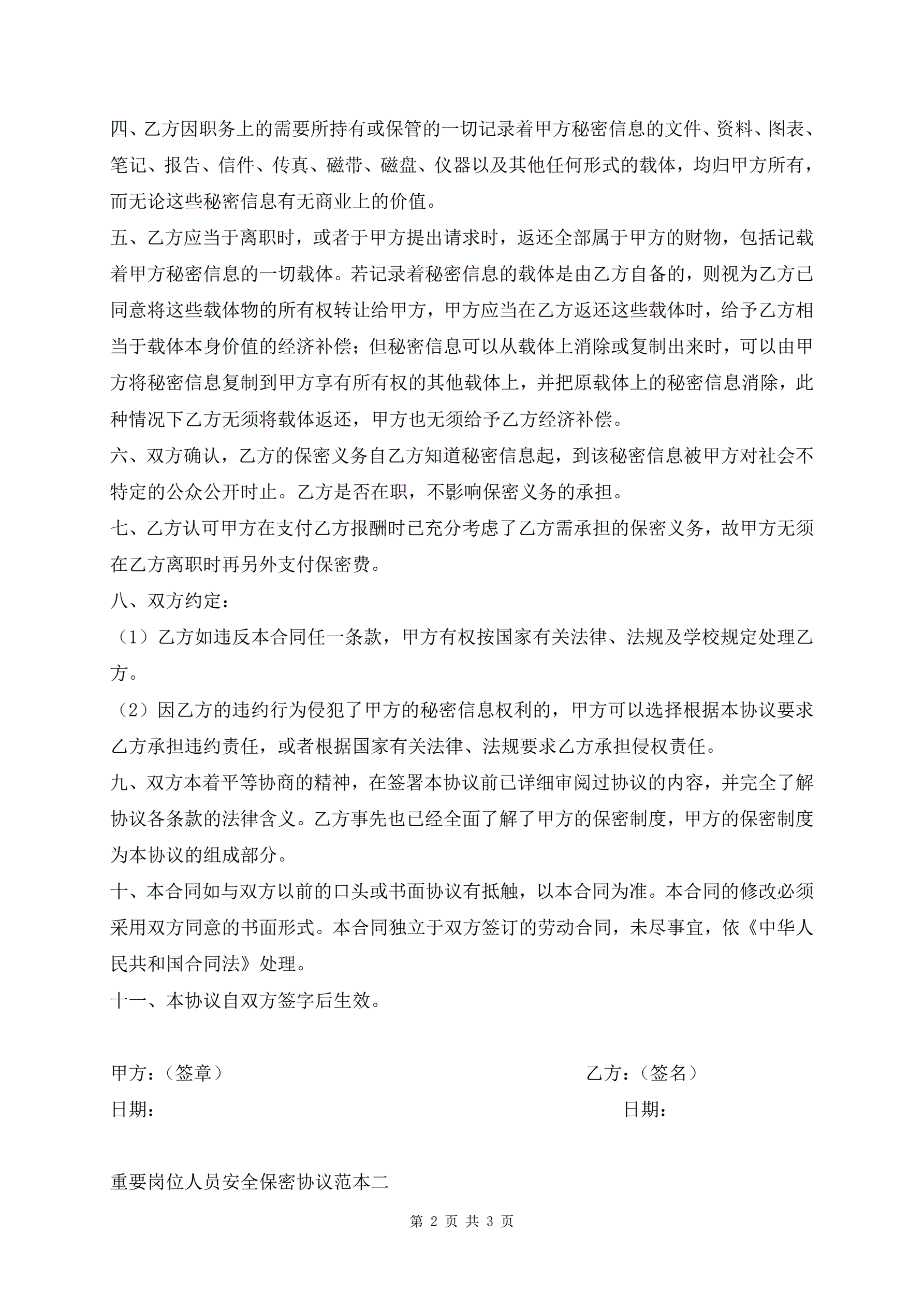 重要岗位人员安全保密协议范本
