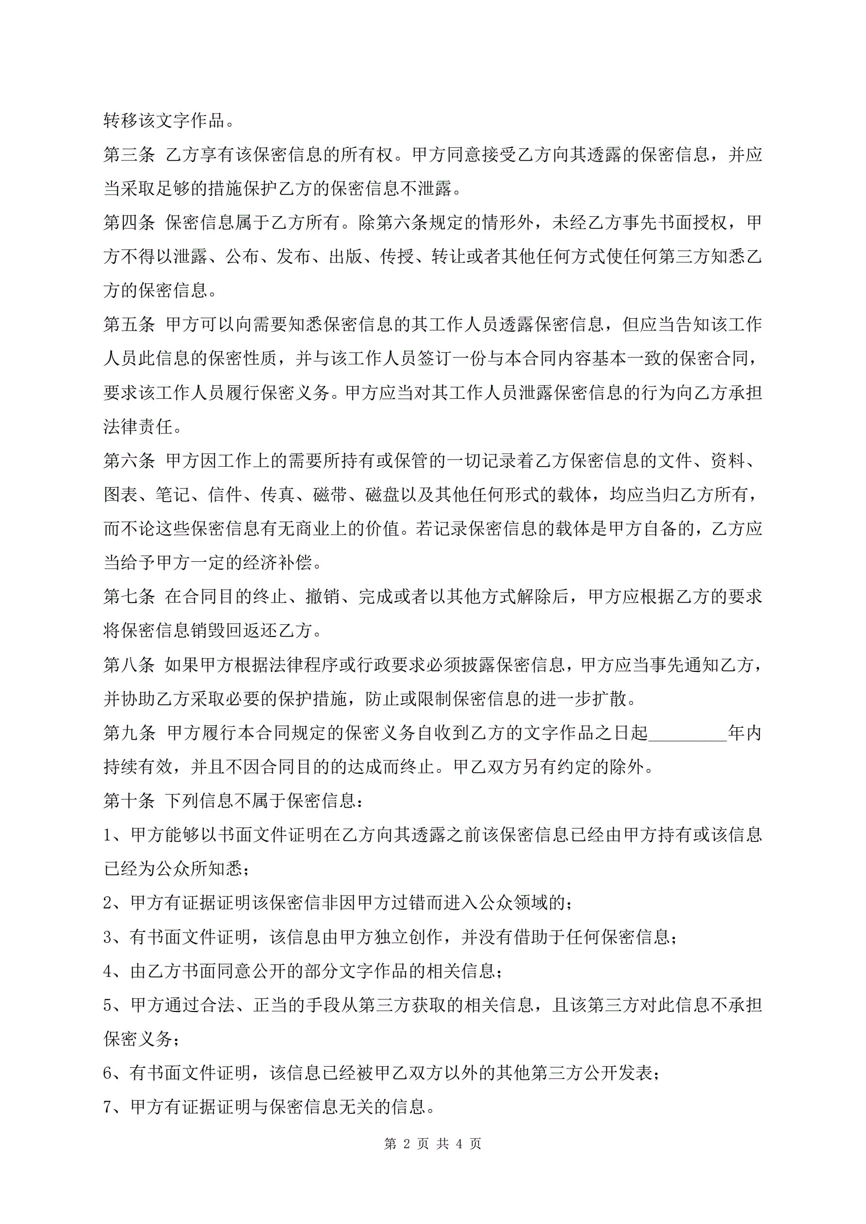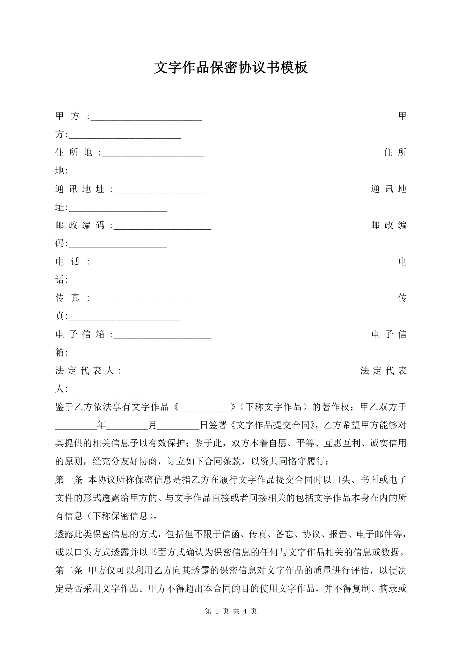 >文字作品保密协议书模板
