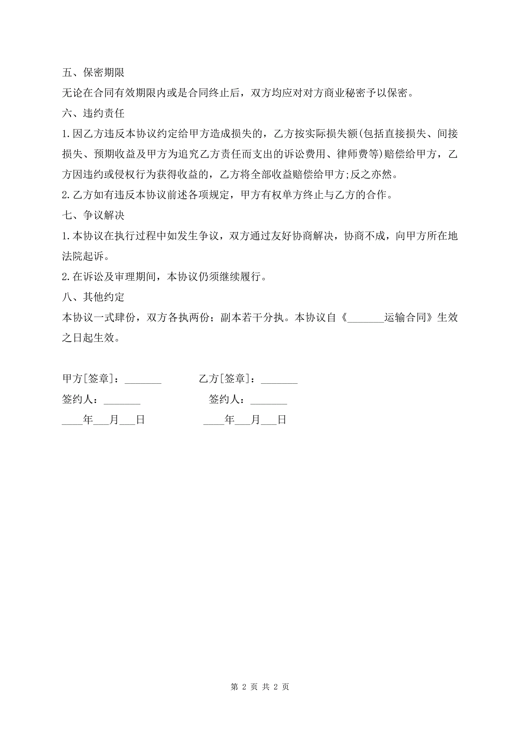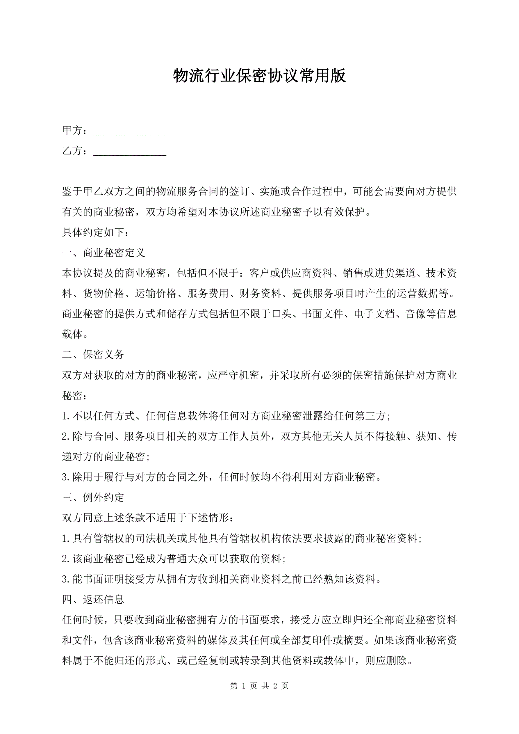 >物流行业保密协议常用版