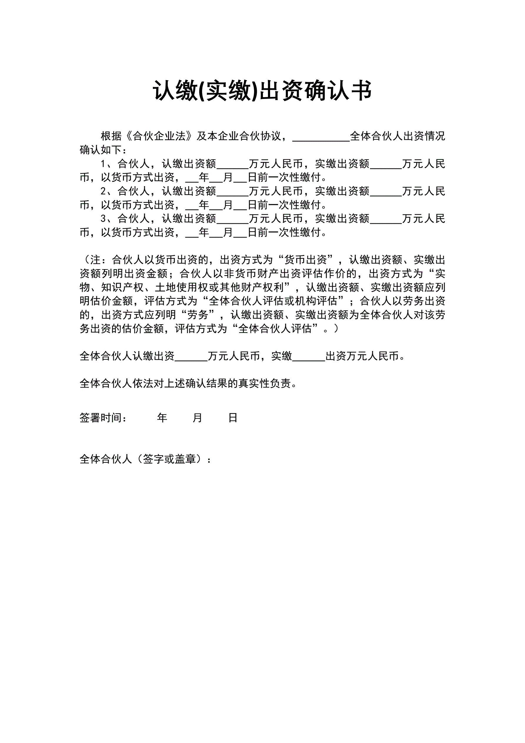 >认缴(实缴)出资确认书(指导版)