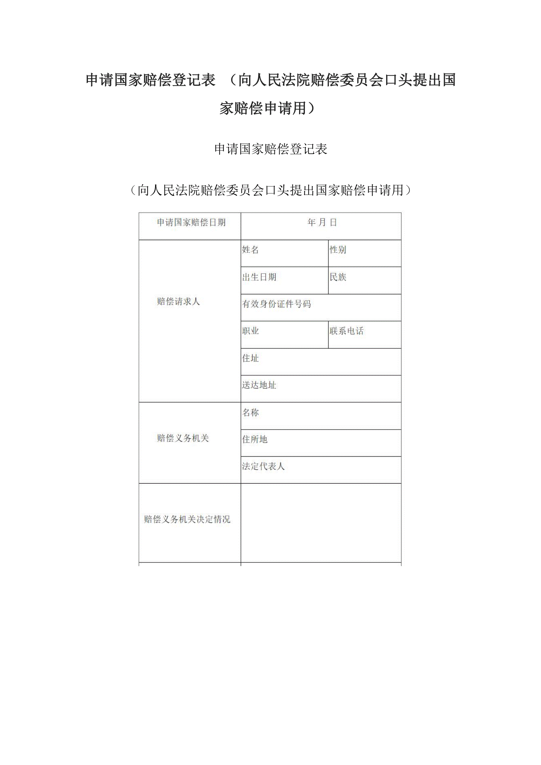 >申请国家赔偿登记表(向人民法院赔偿委员会口头提出国家赔偿申请用)