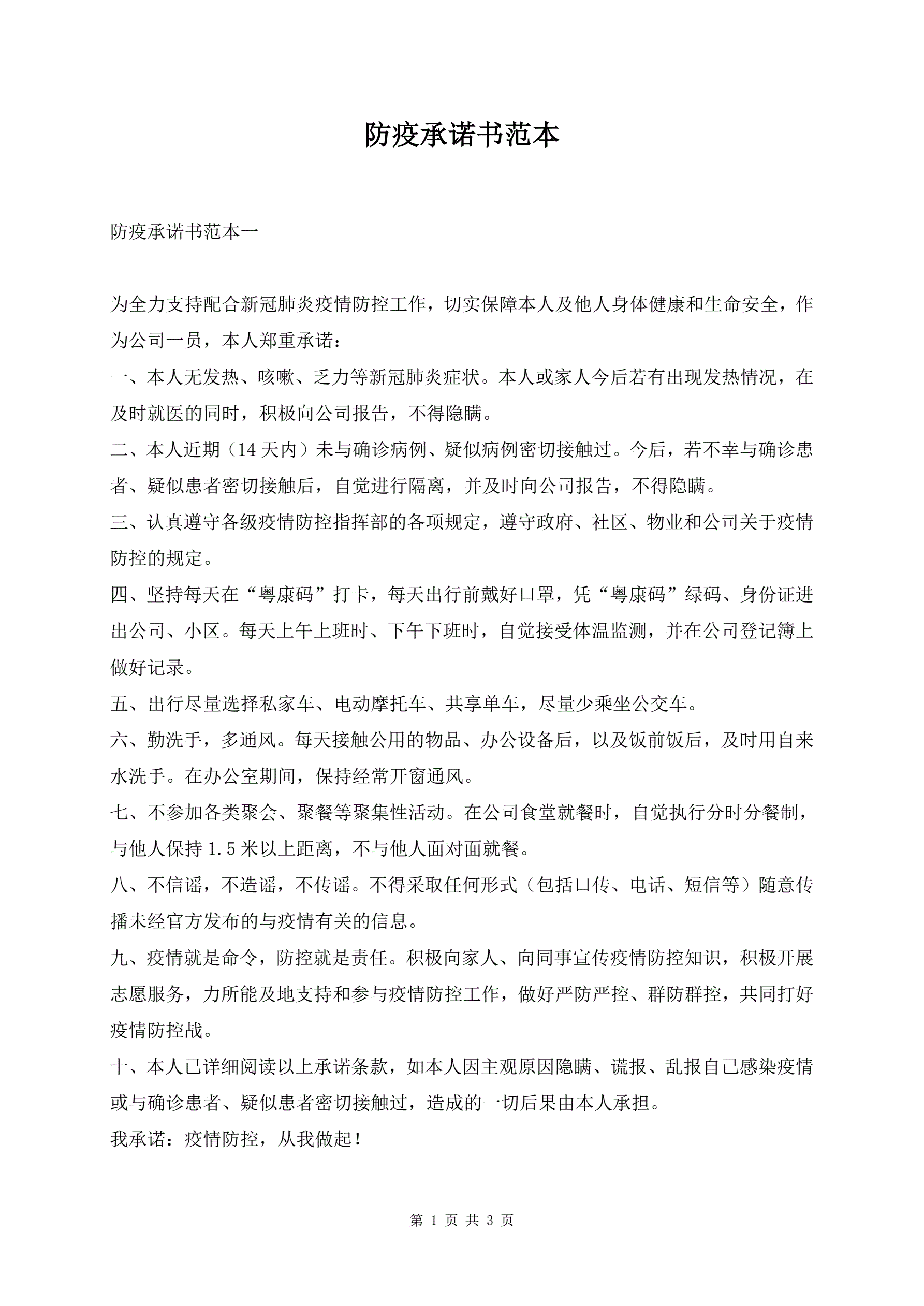 防疫承诺书范本