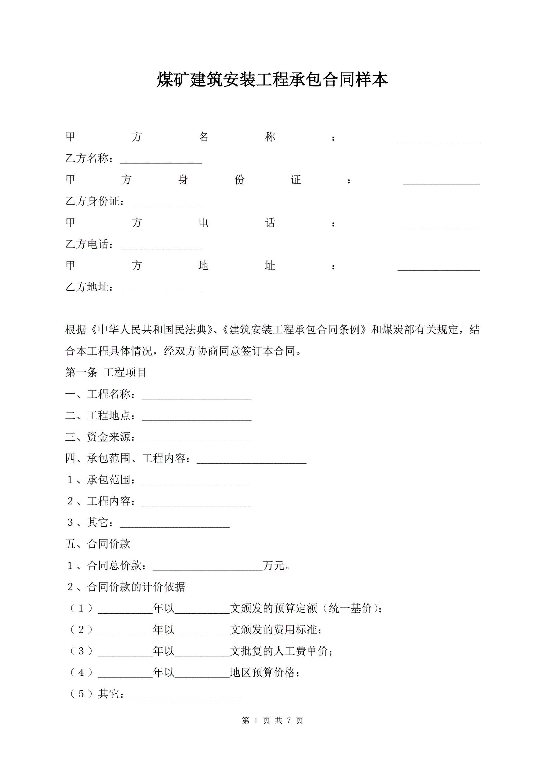 >煤矿建筑安装工程承包合同样本