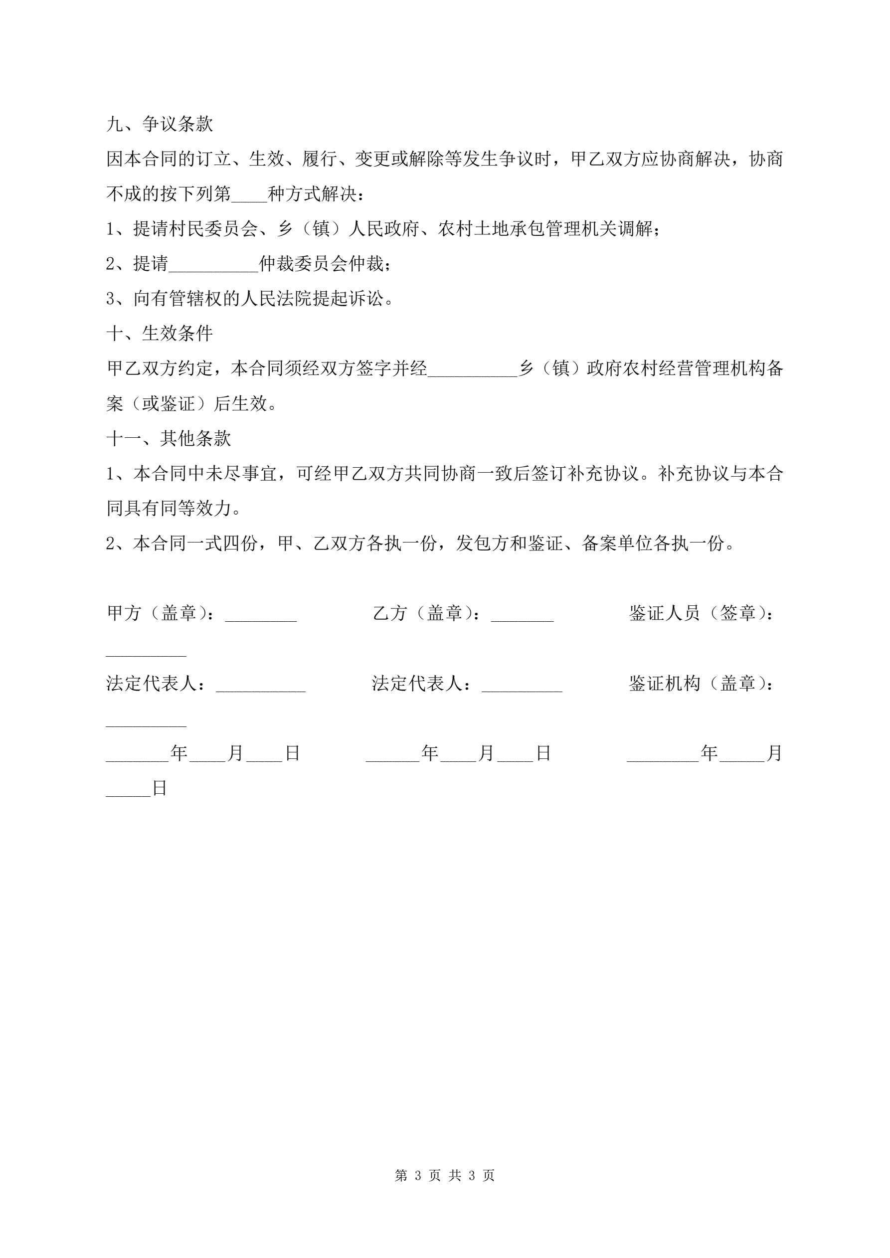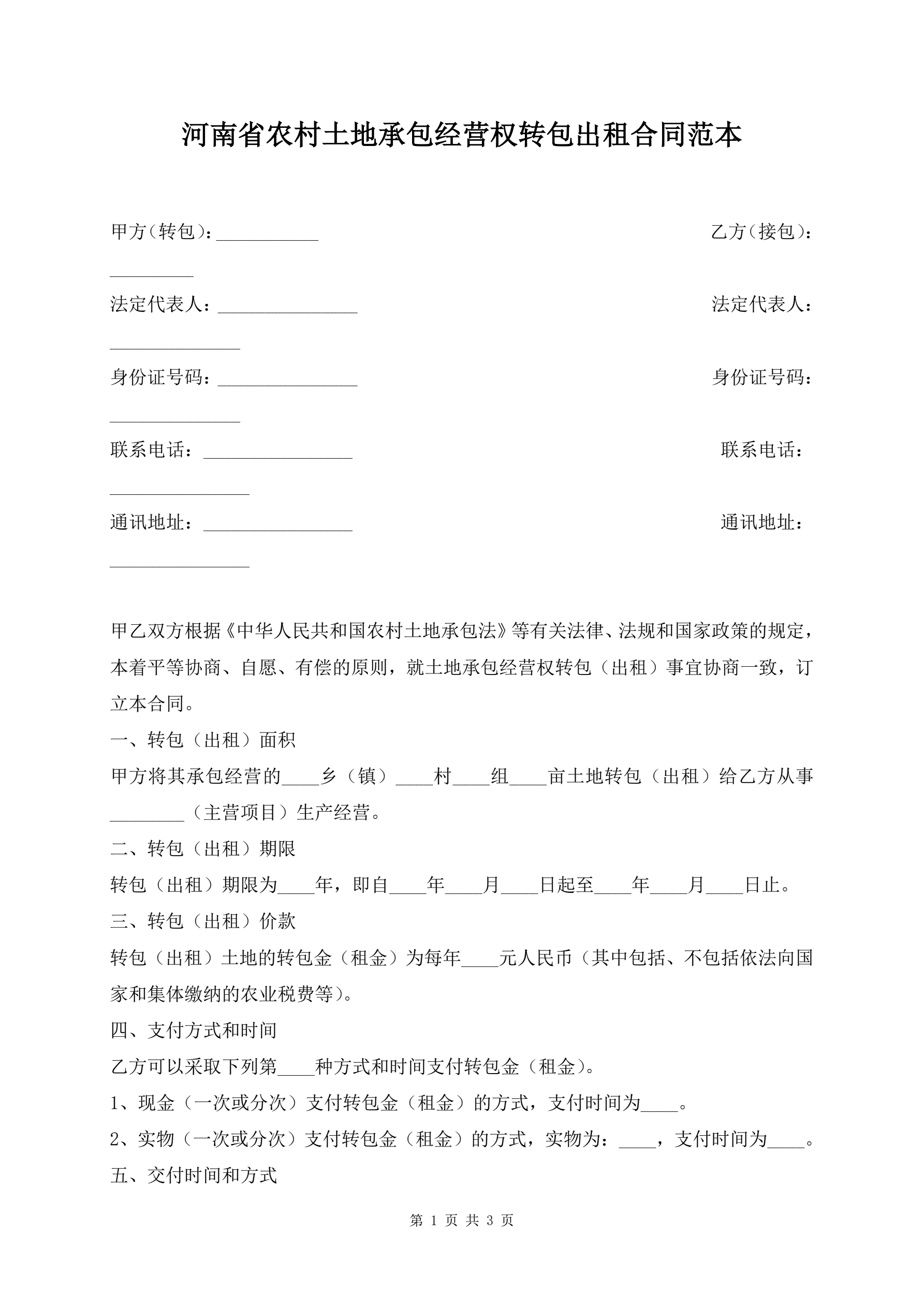 >河南省农村土地承包经营权转包出租合同范本