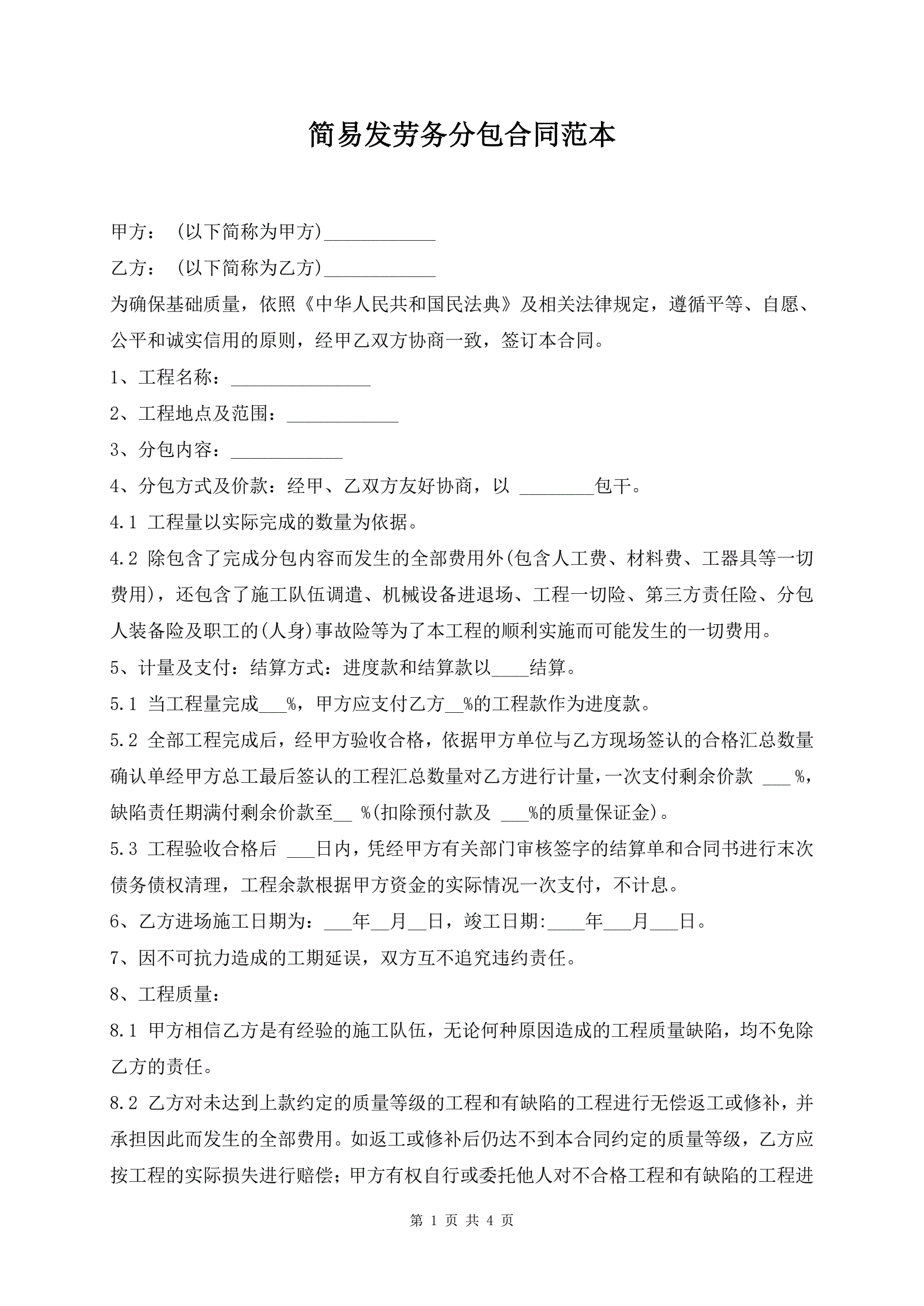 >简易发劳务分包合同范本