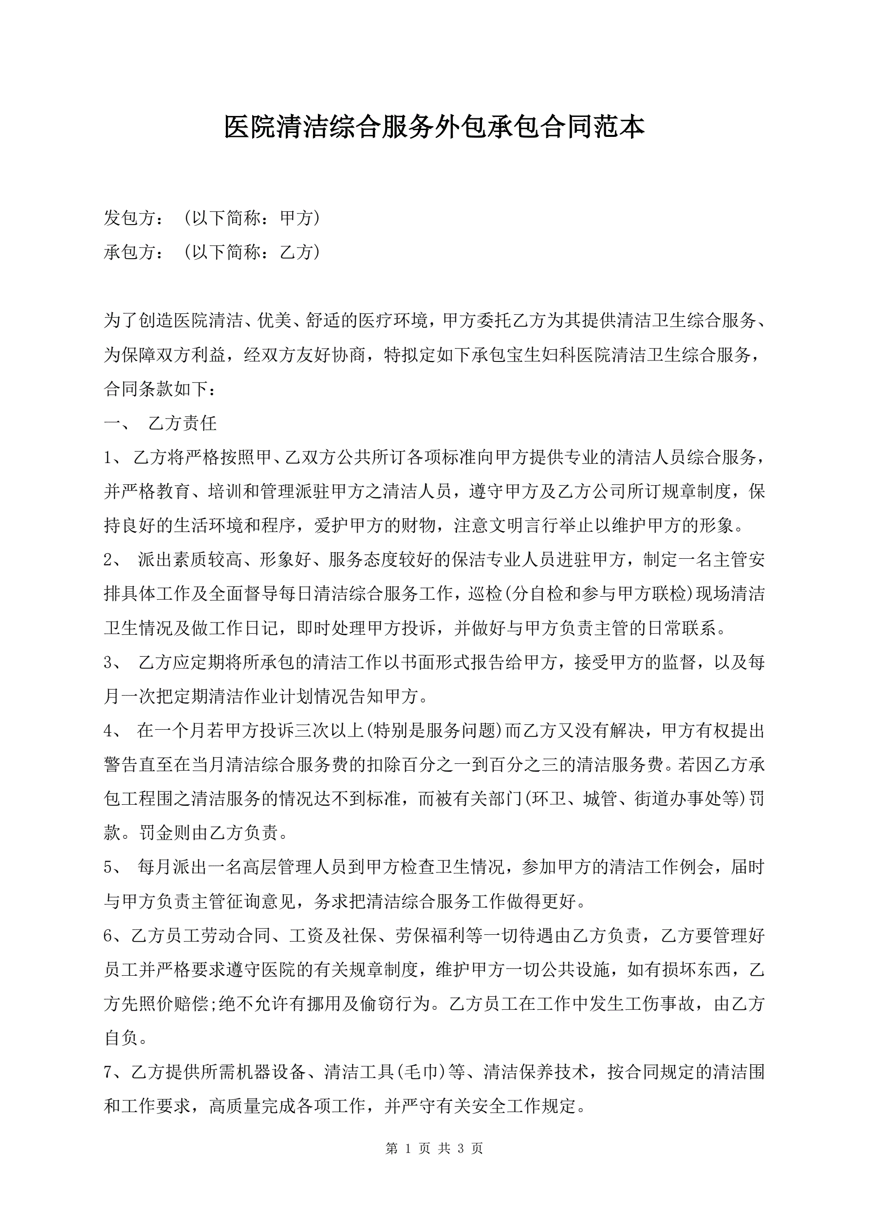 医院清洁综合服务外包承包合同范本