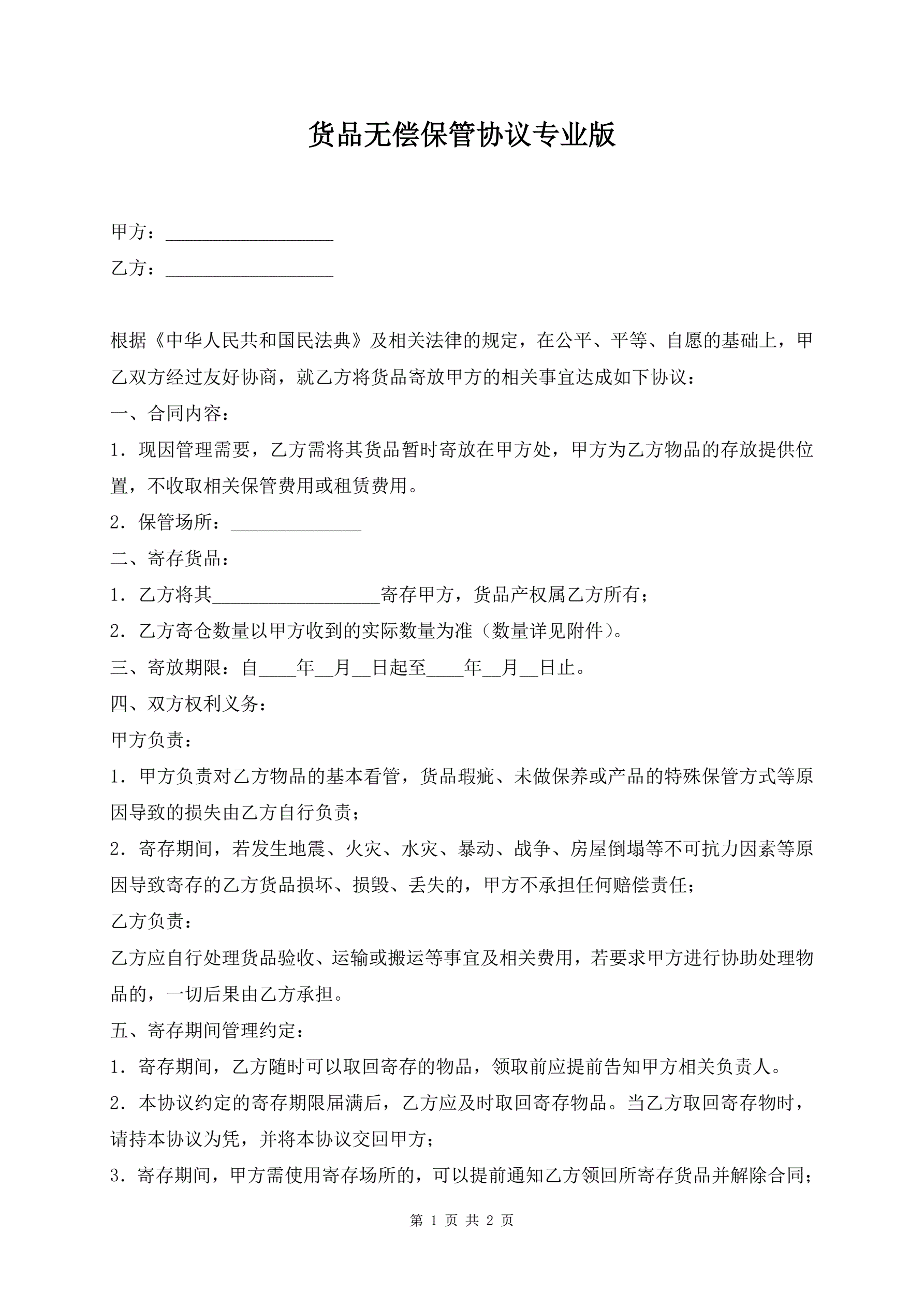 货品无偿保管协议专业版
