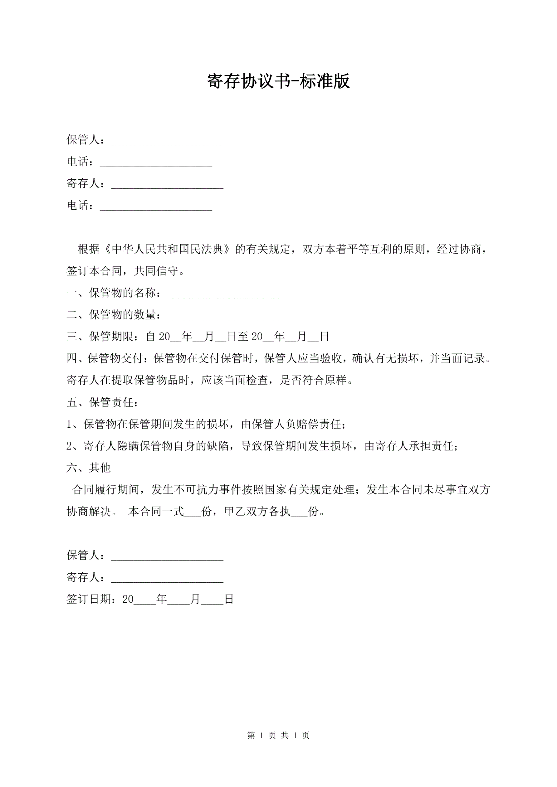 寄存协议书-标准版