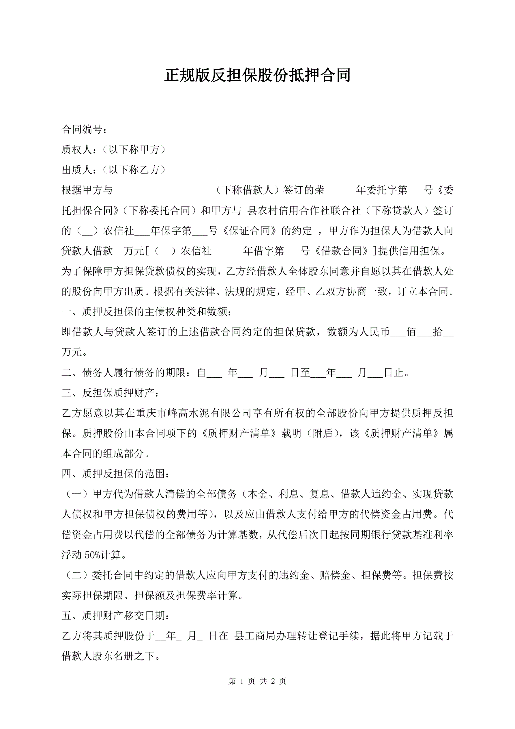 >正规版反担保股份抵押合同